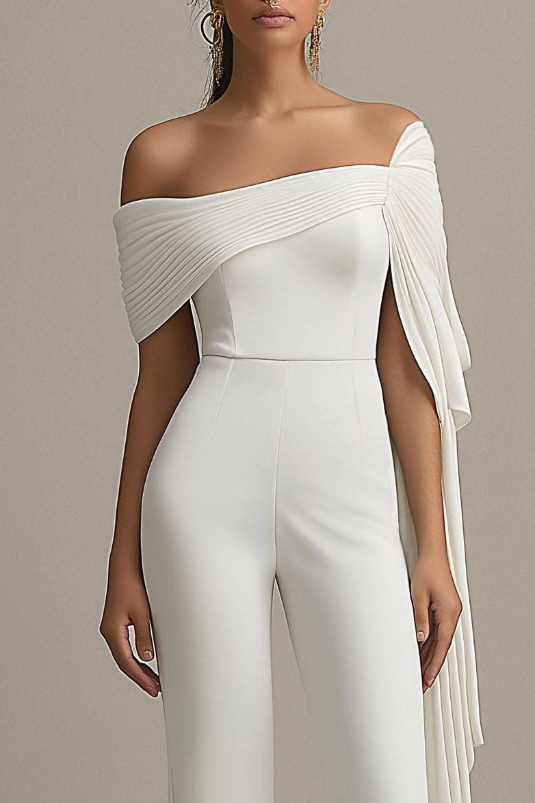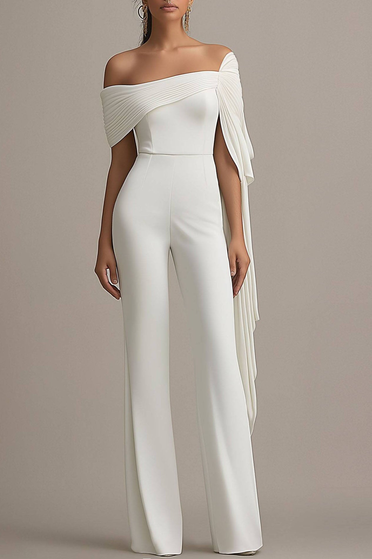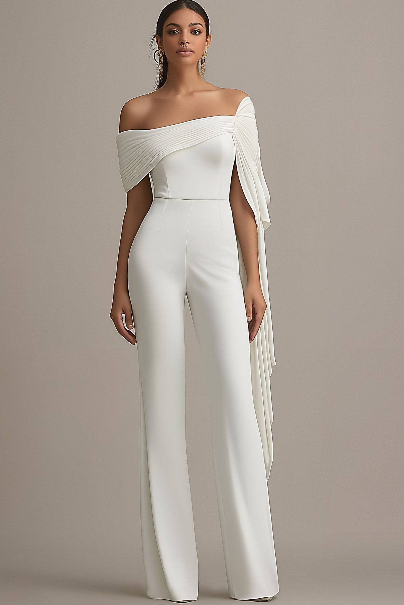 Formal Off-Shoulder White Draped Wide-Leg Jumpsuit