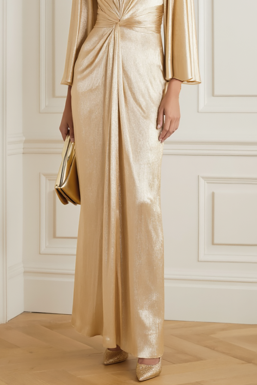 Formal Party Dress Gold V-Neck Long Sleeve Maxi Dress