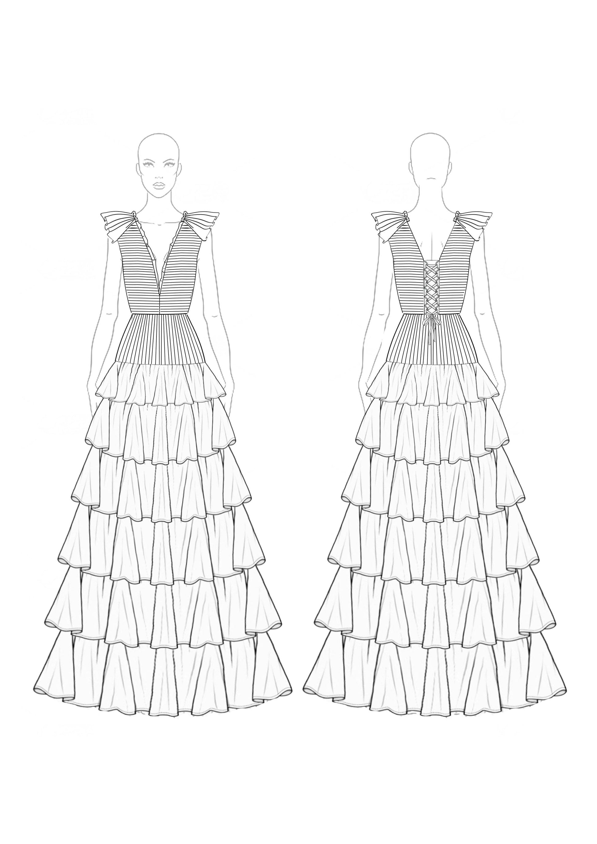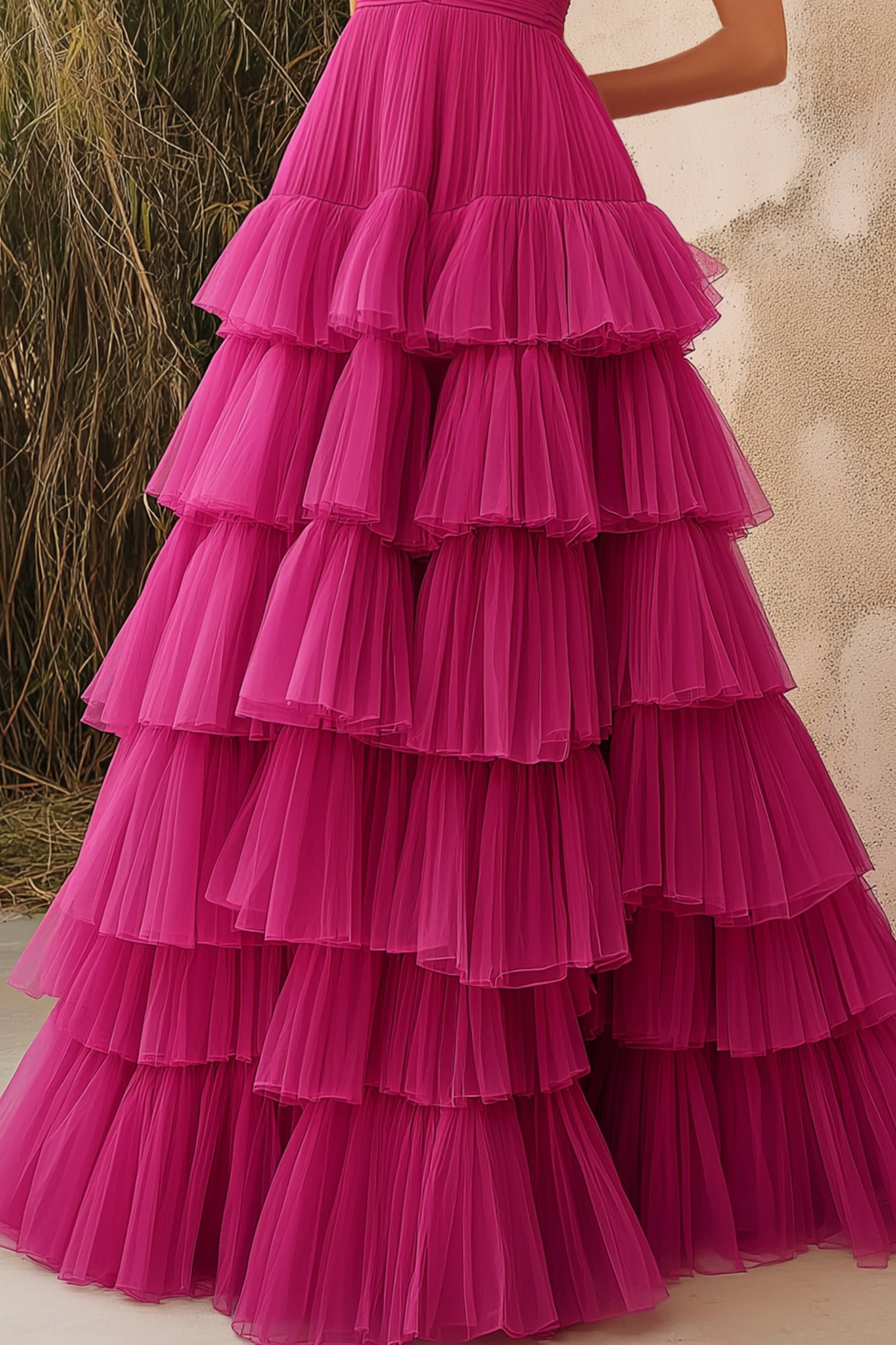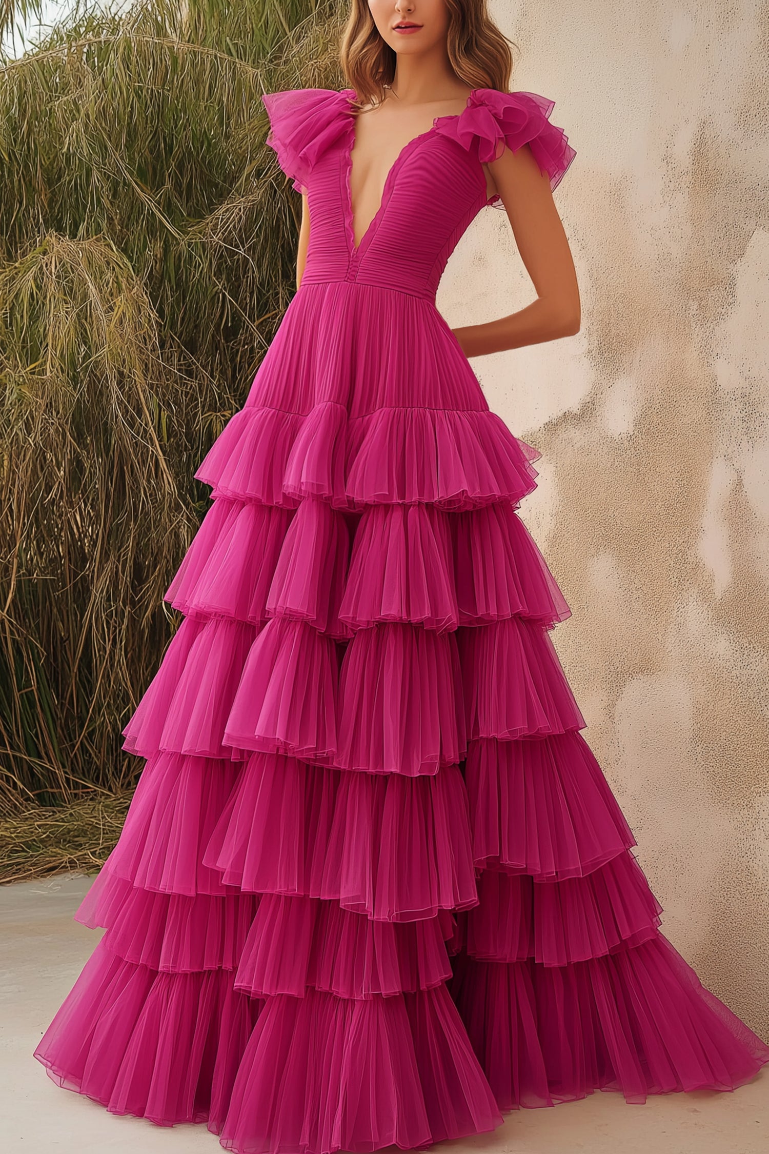 This formal prom dress in rose red boasts a sleeveless V-neck design with tiered pleats for added volume and elegance. Made from luxurious fabric, it’s perfect for prom, gala events, or any formal occasion. A timeless ball gown that combines sophistication with style.
