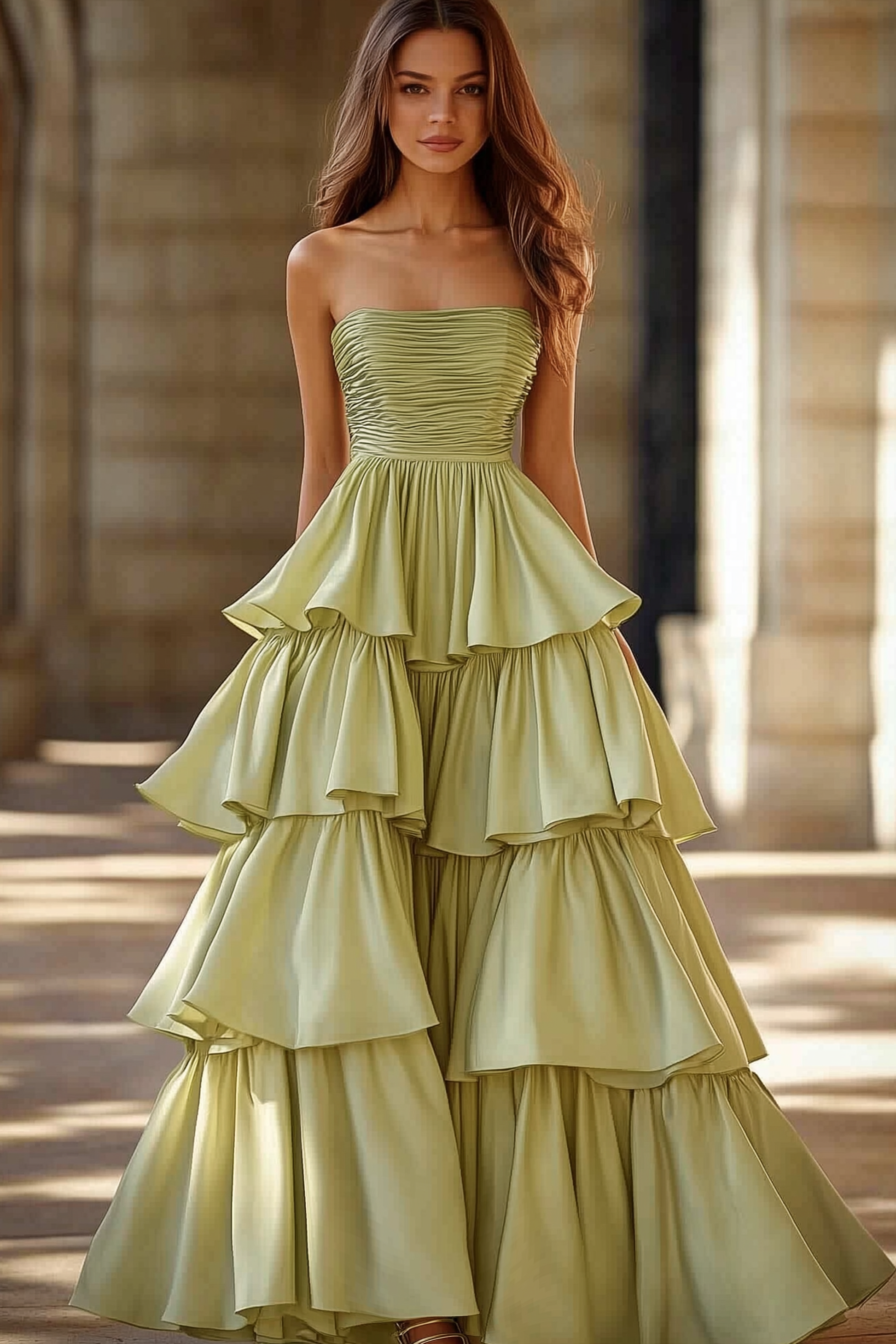 Make a graceful impression in this light green strapless prom gown. The tiered design and floor-length silhouette create timeless beauty, perfect for formal events. Its soft color and airy layers bring romantic sophistication to any occasion.