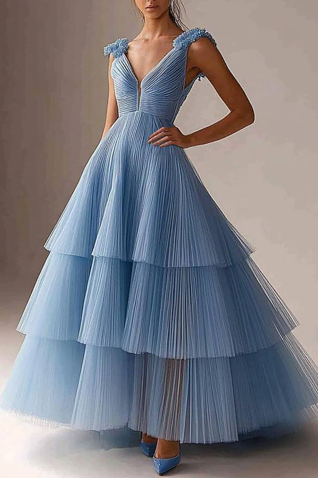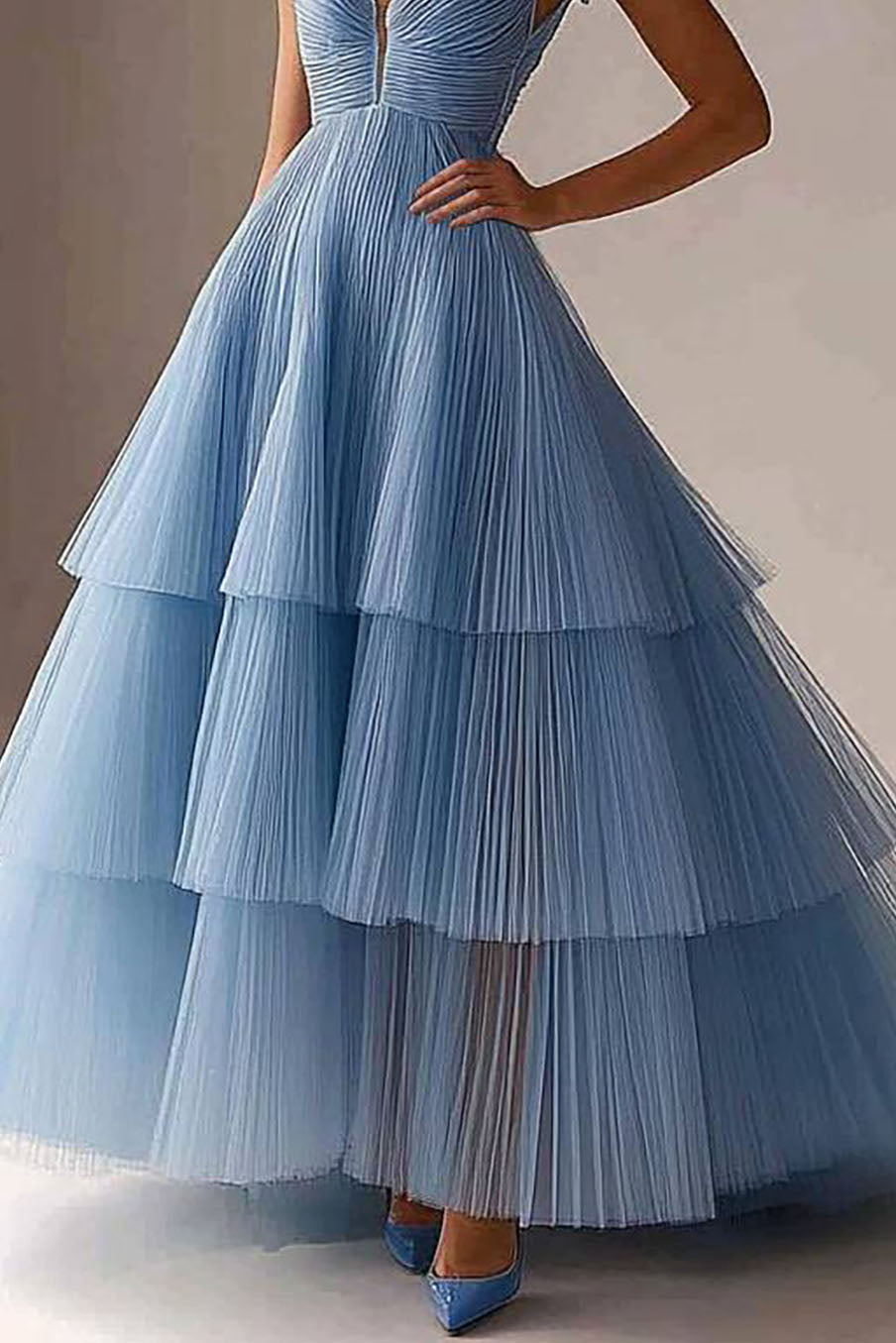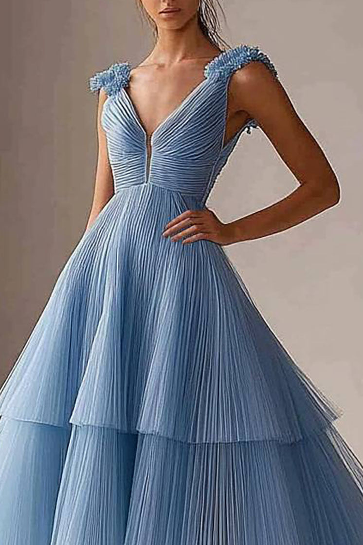 Formal Prom Tiered Dress Pleated Blue V-Neck Sleeveless Maxi Dress