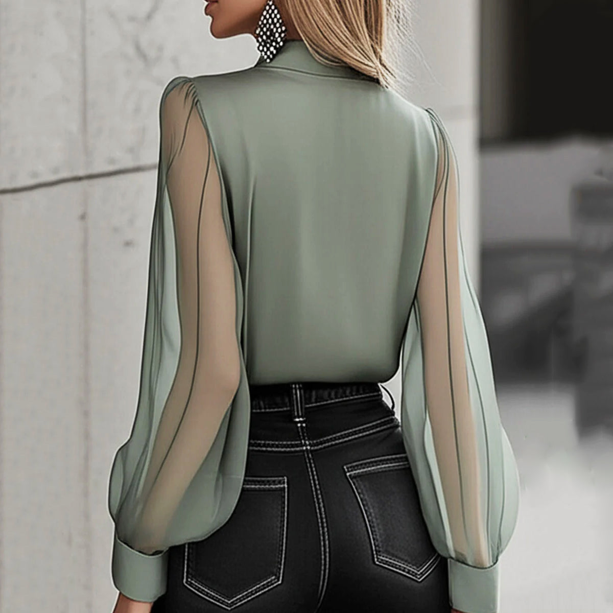 Formal Shirt Collar Translucent Lantern Sleeve Button Blouse