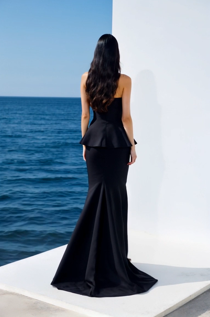 This black strapless mermaid gown is designed for formal occasions. The fitted bodice enhances your curves, while the floor-length hem adds elegance and drama. Perfect for evening galas or formal parties.