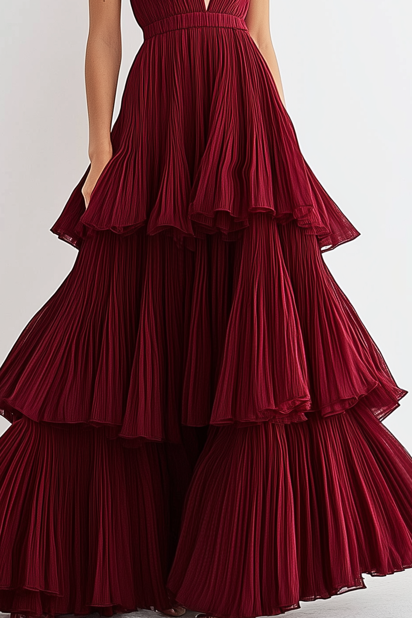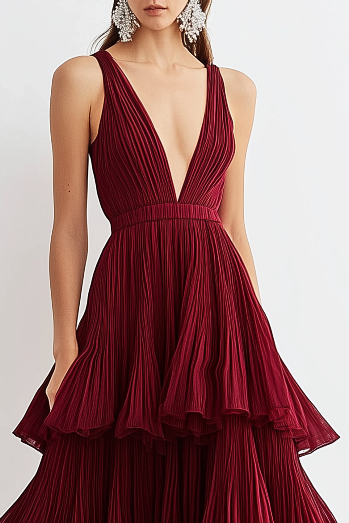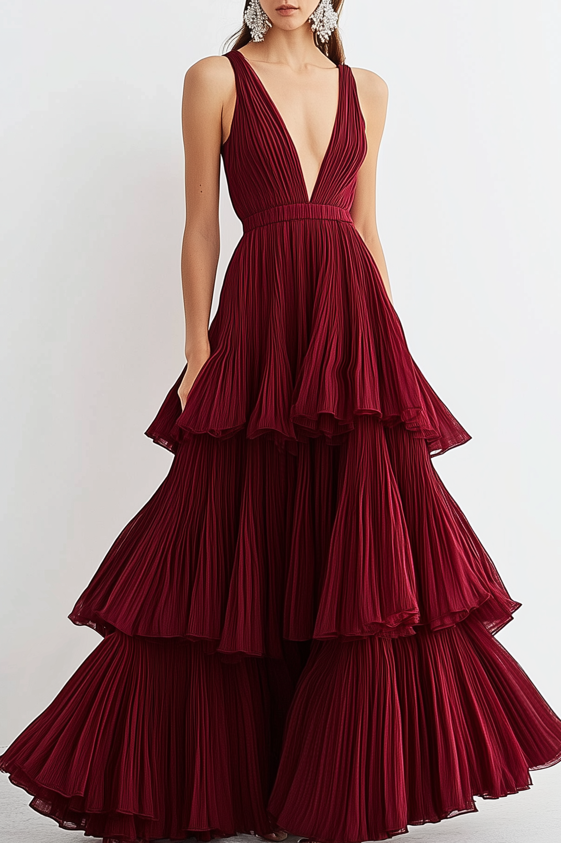 Turn heads in this vibrant red floor-length gown featuring a deep V-neckline and pleated tiered layers. The sleeveless design complements the flowing structure, creating a bold yet elegant look for formal events and evening celebrations.