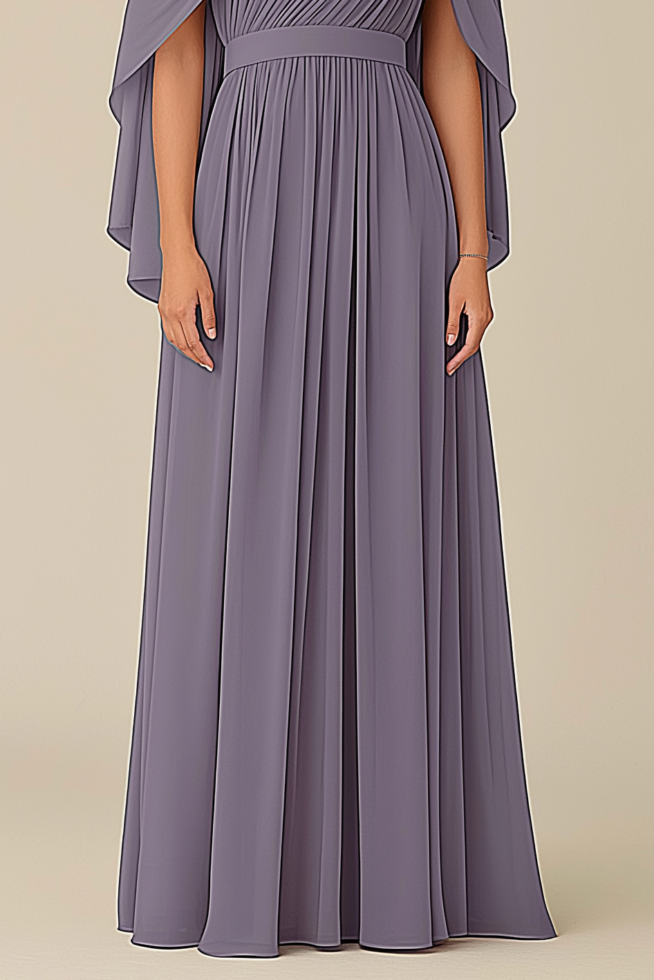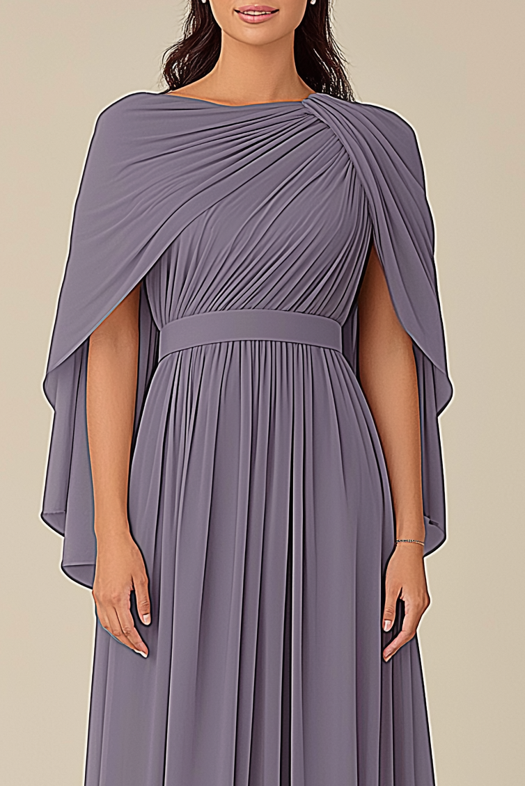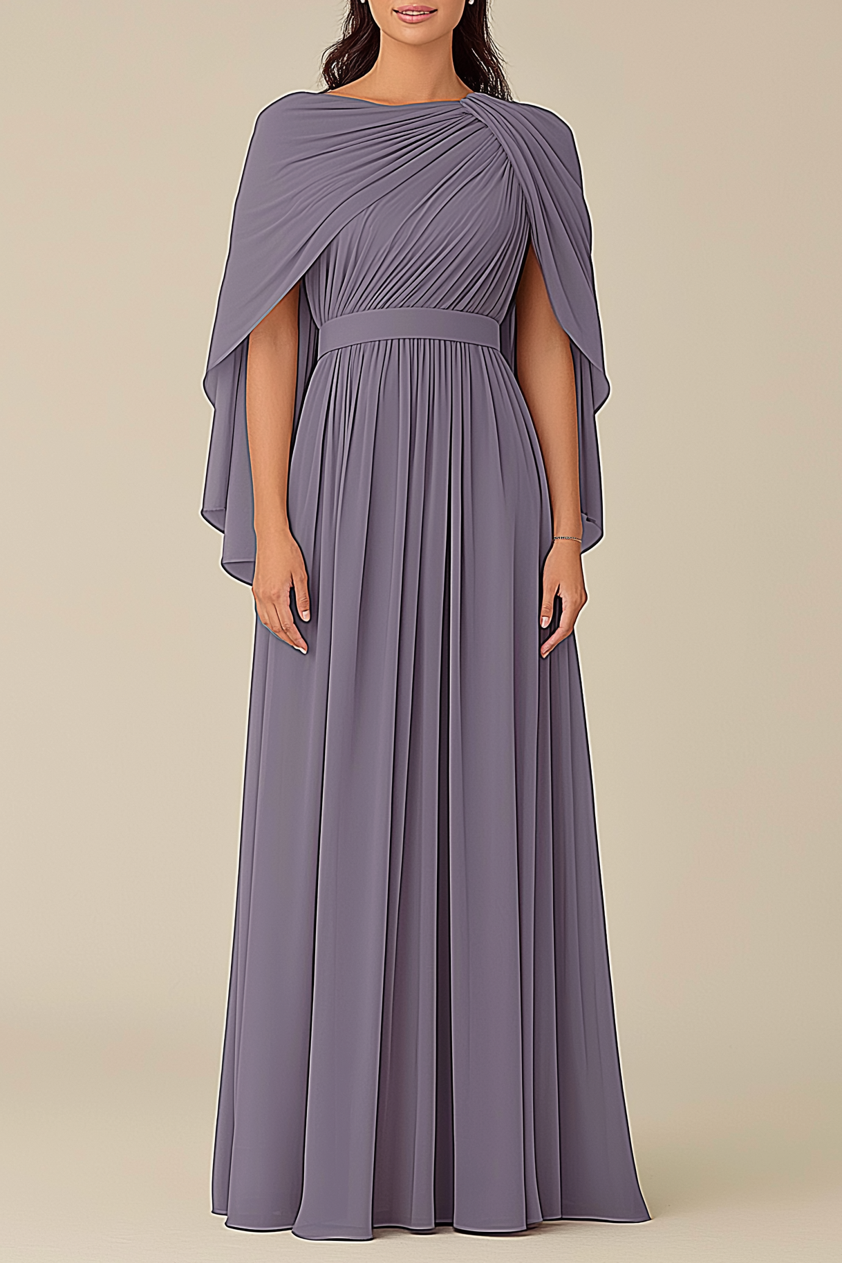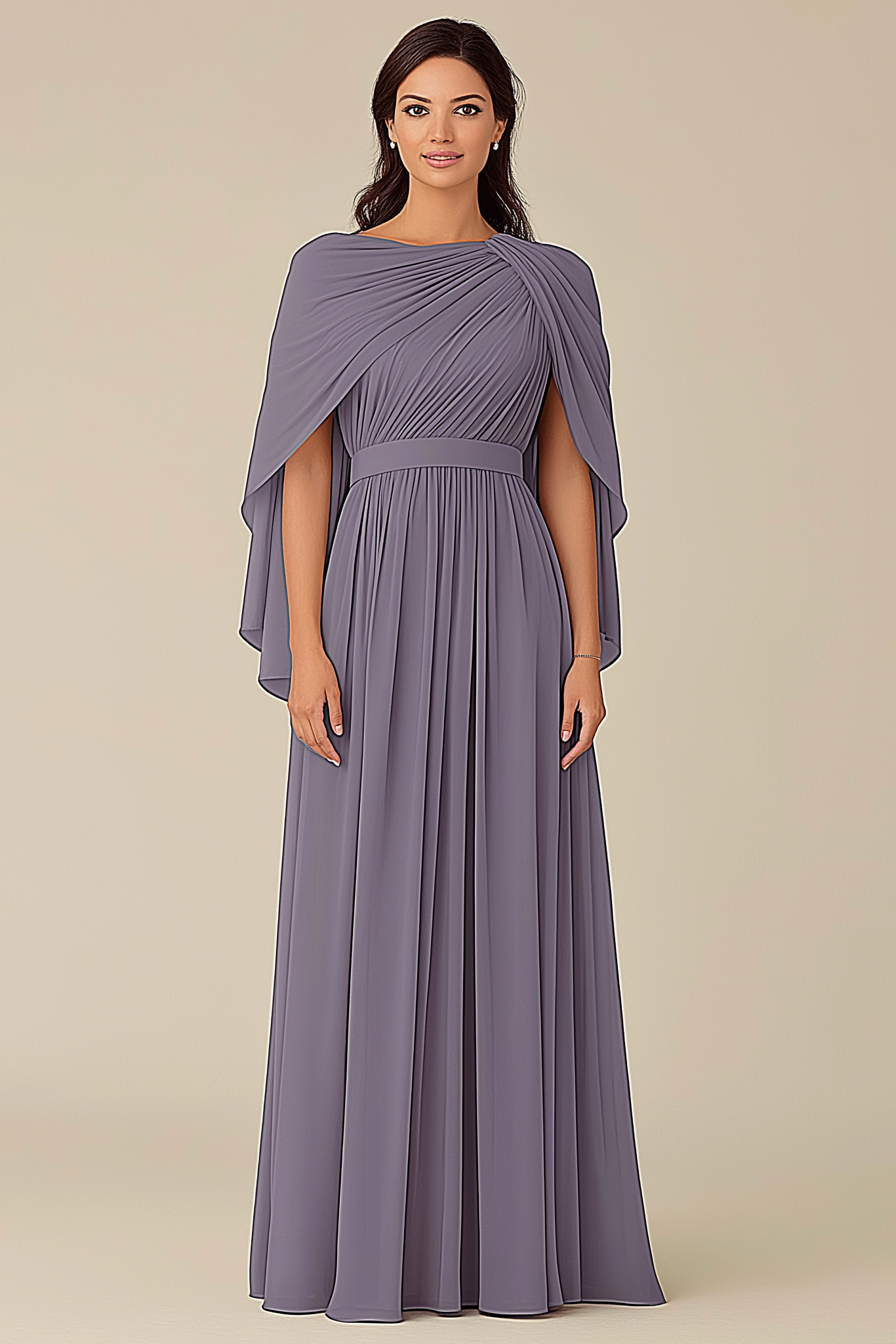A soft cape overlay elevates this grey-blue floor-length dress, offering modesty and grace. Perfect for mothers of the bride, it blends comfort with dignified style to make any special moment even more memorable.