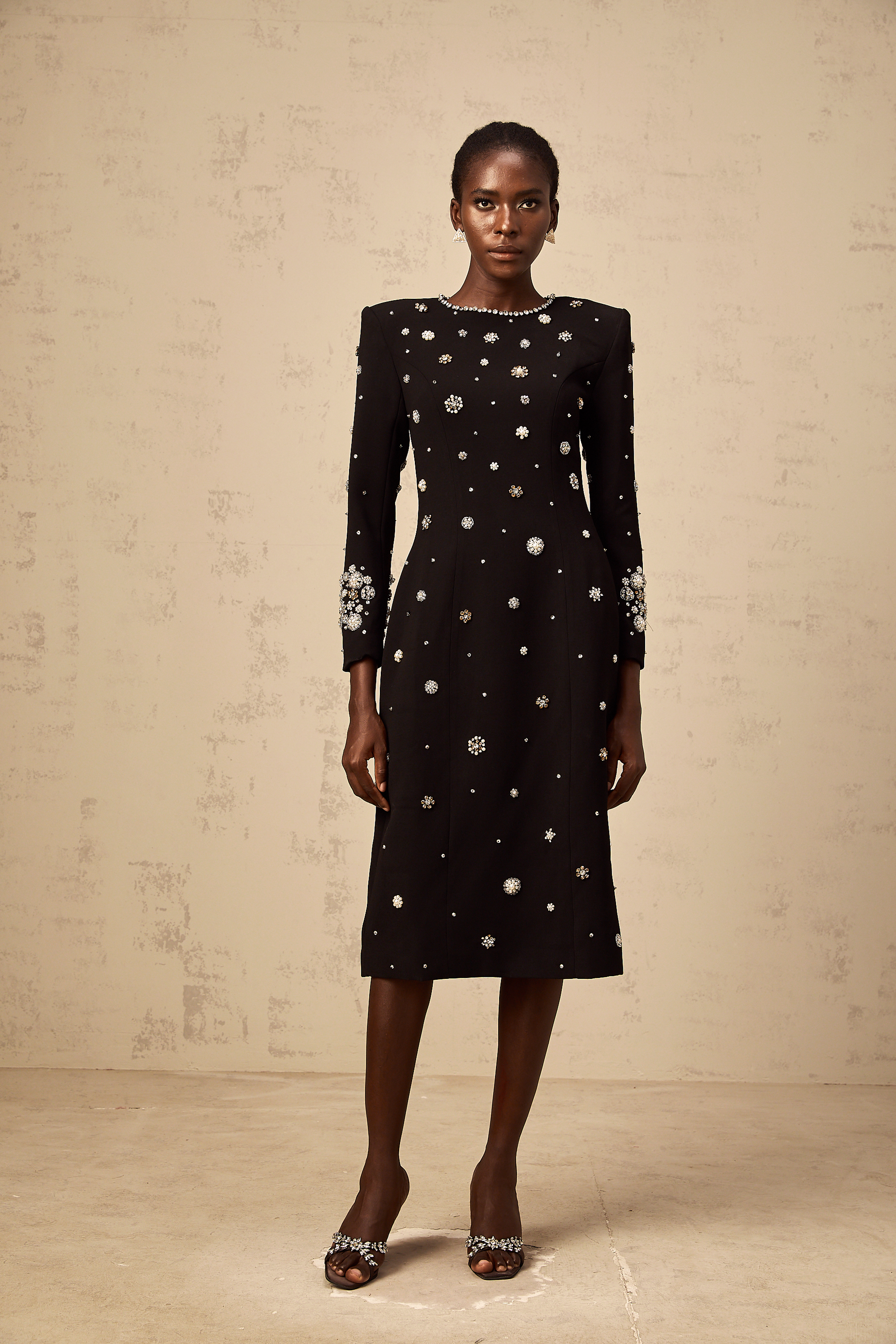 Gaëlle black dart-detail embellished midi dress