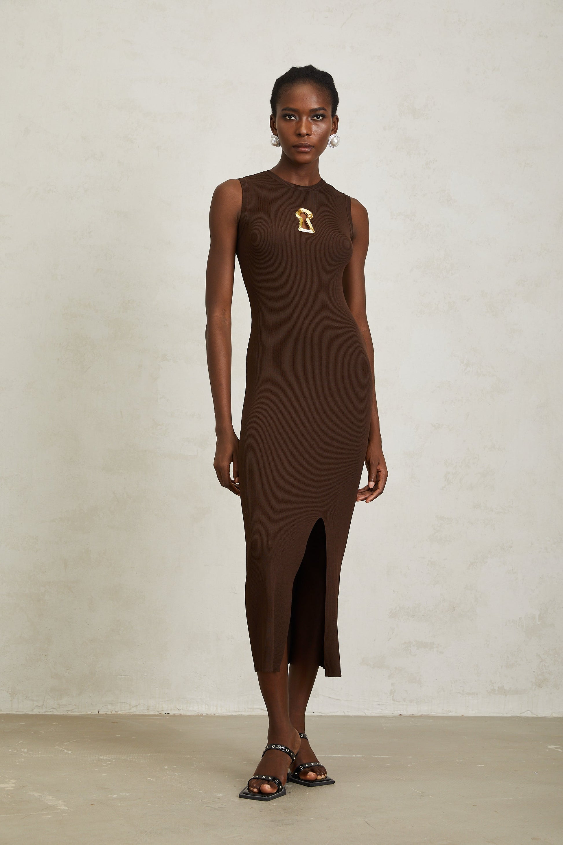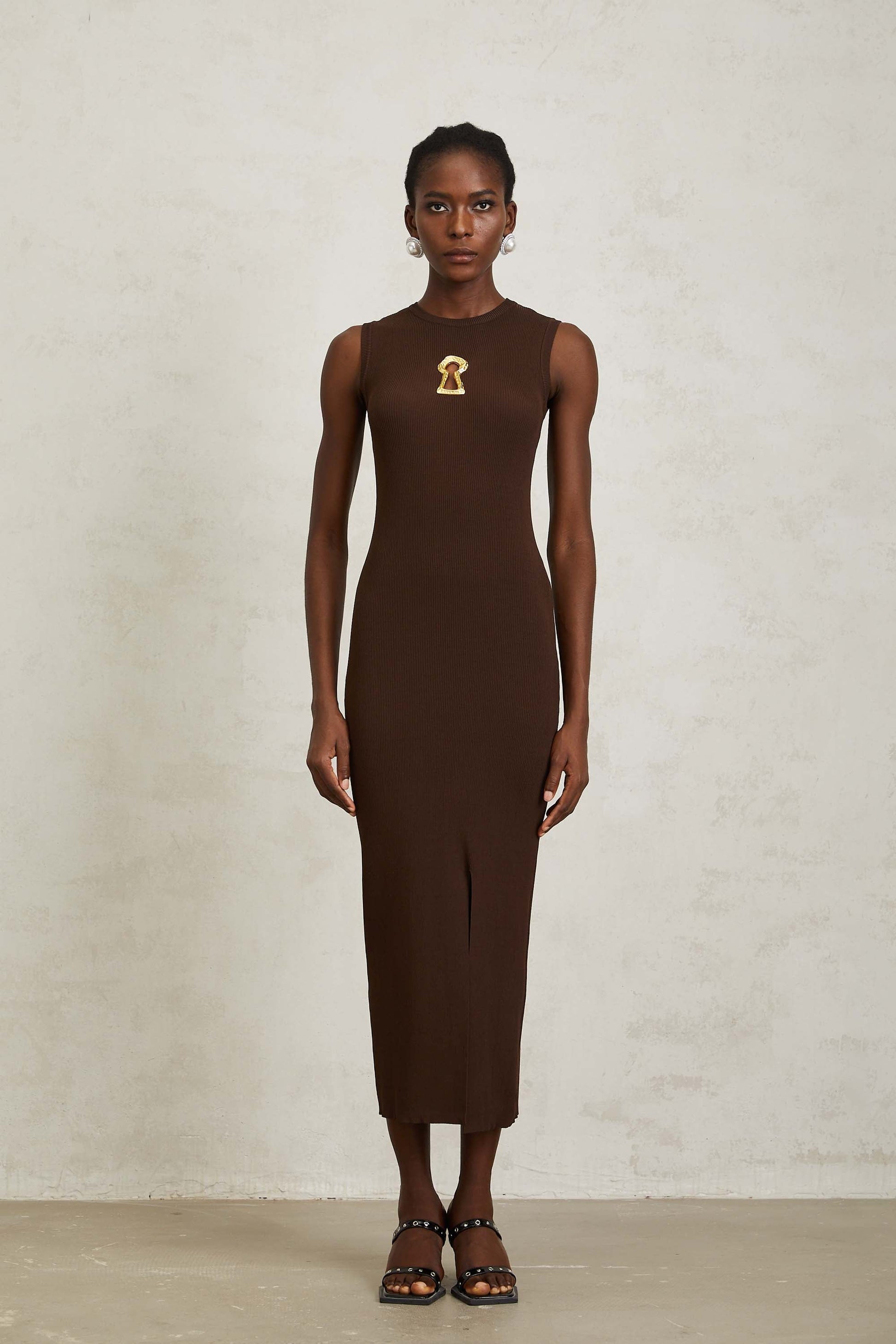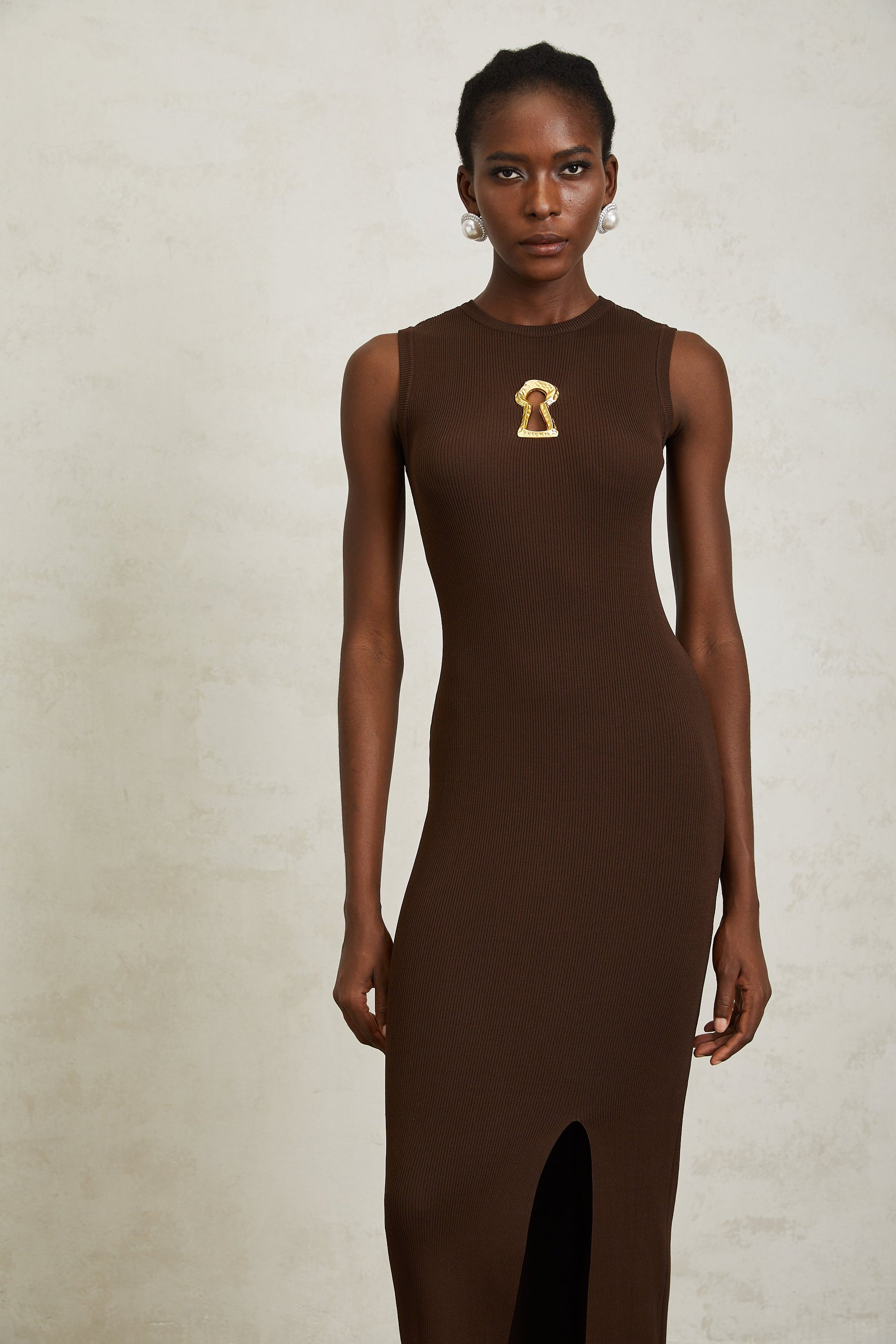 Gaëlle Brown Keyhole Ribbed Knit Midi Dress