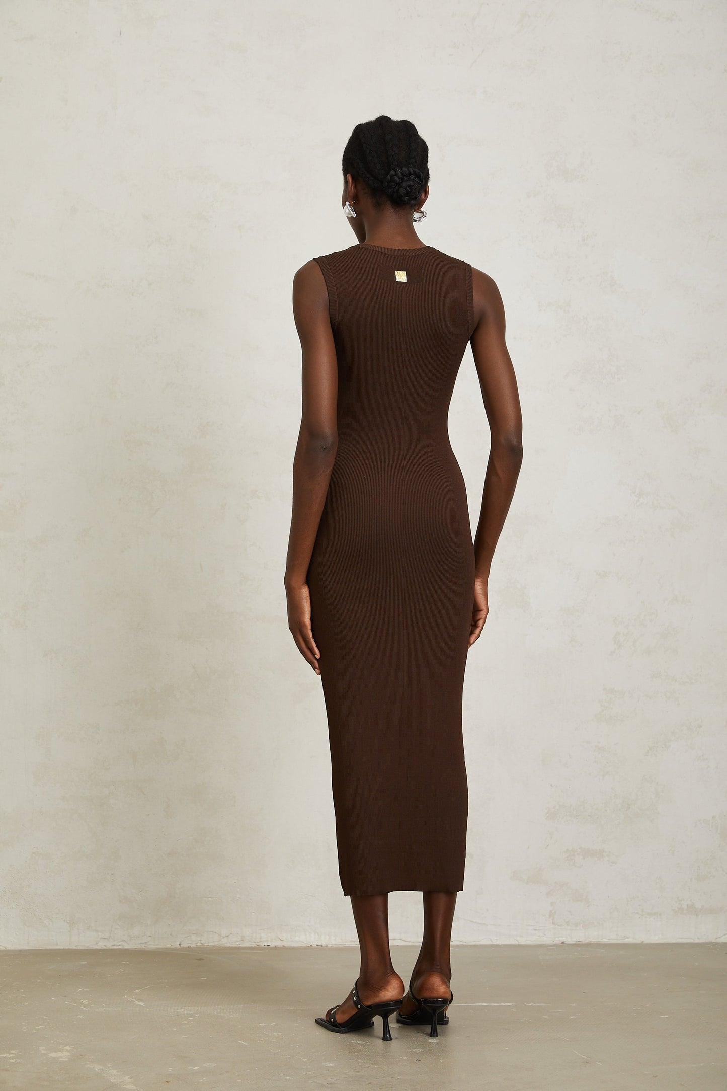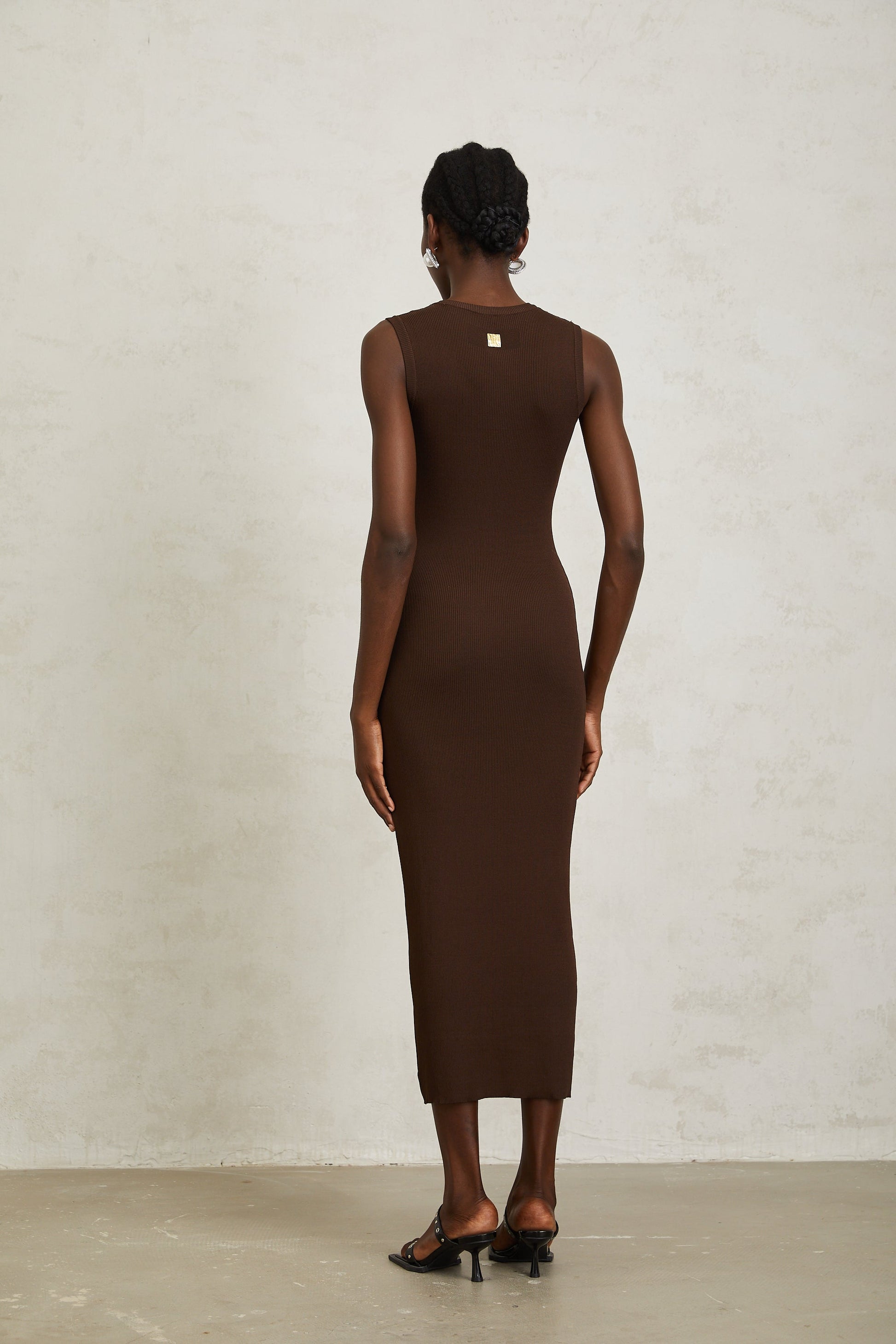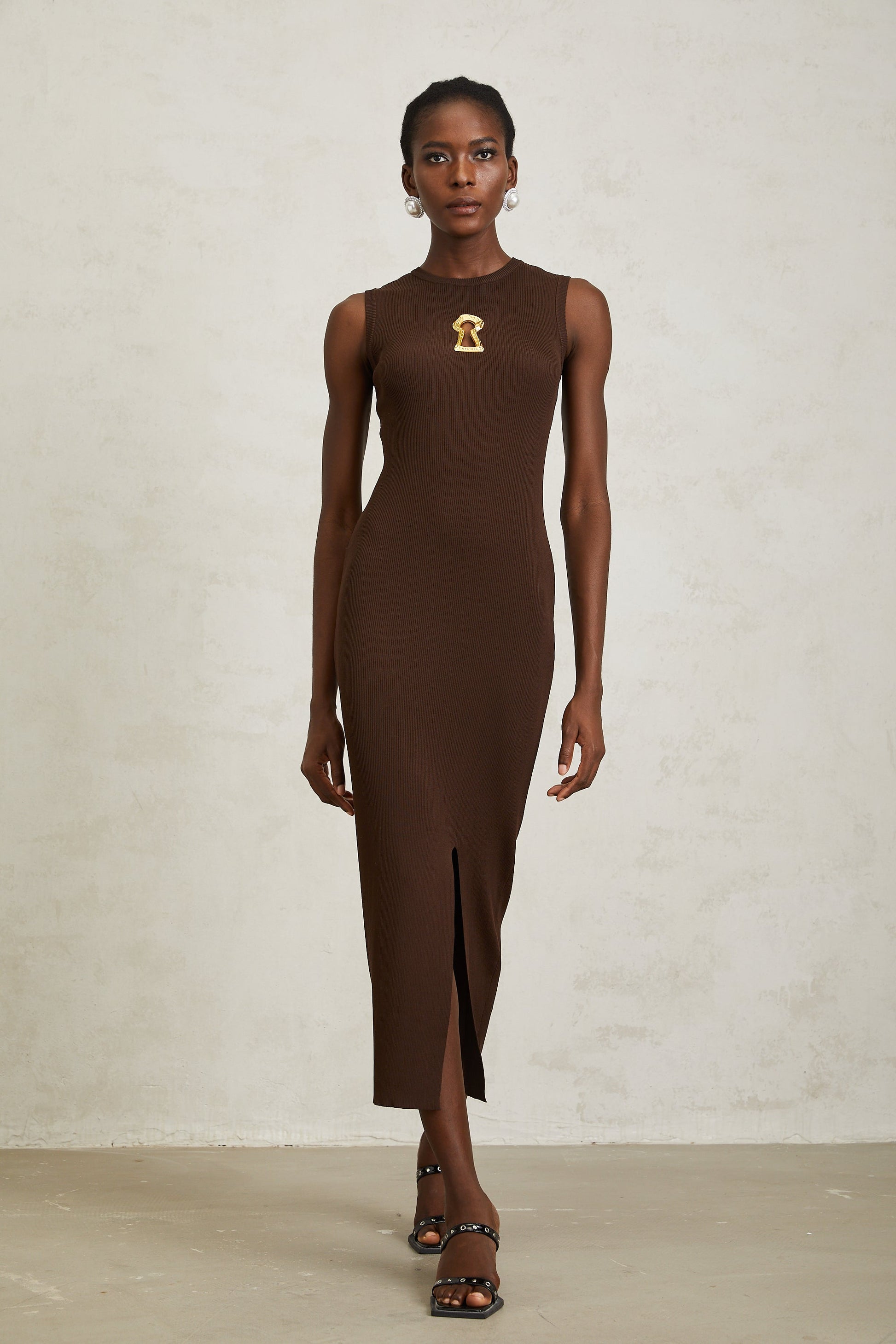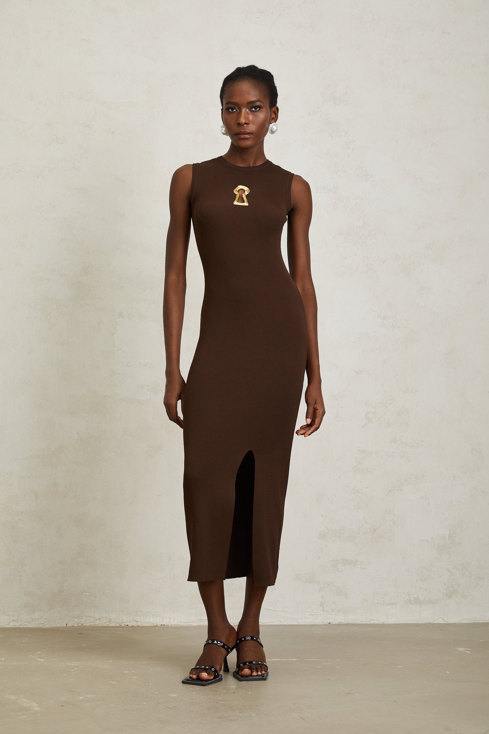 Gaëlle Brown Keyhole Ribbed Knit Midi Dress
