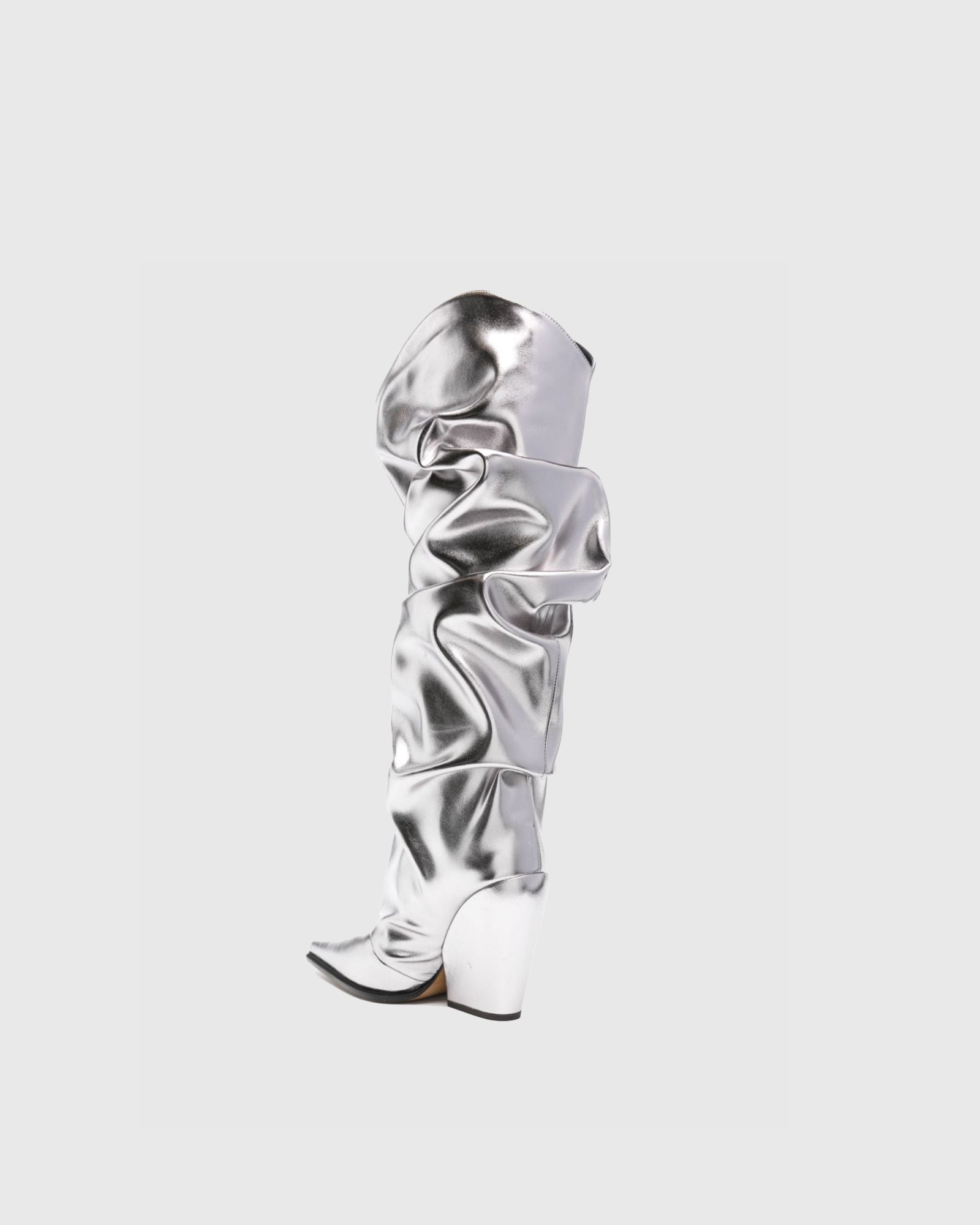 Slip into these Gaia Ruched Metallic Knee High Boots for a touch of glamour and style. The metallic silver design adds a bold and eye-catching element to your outfit, while the ruched detailing creates a flattering and comfortable fit. Elevate your look with these boots, perfect for any occasion.