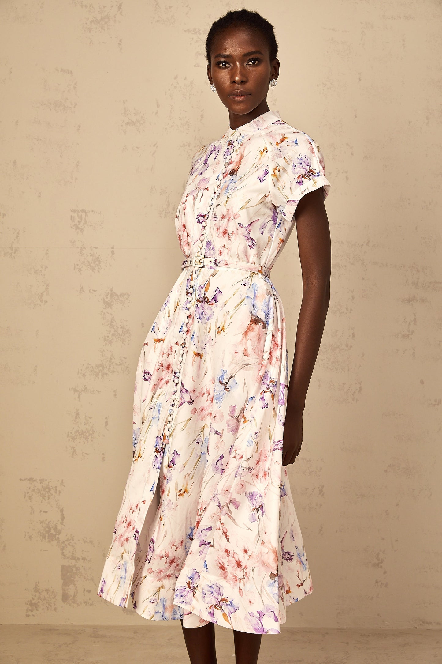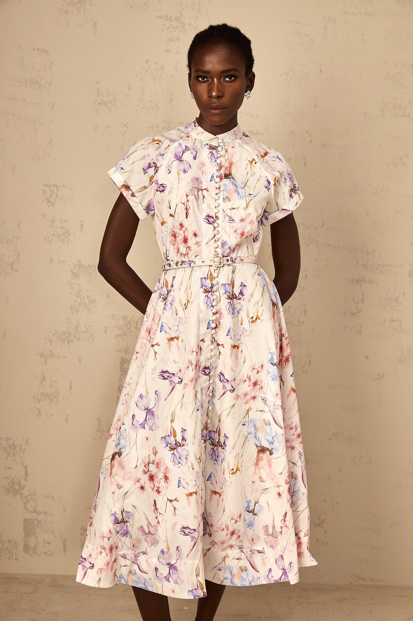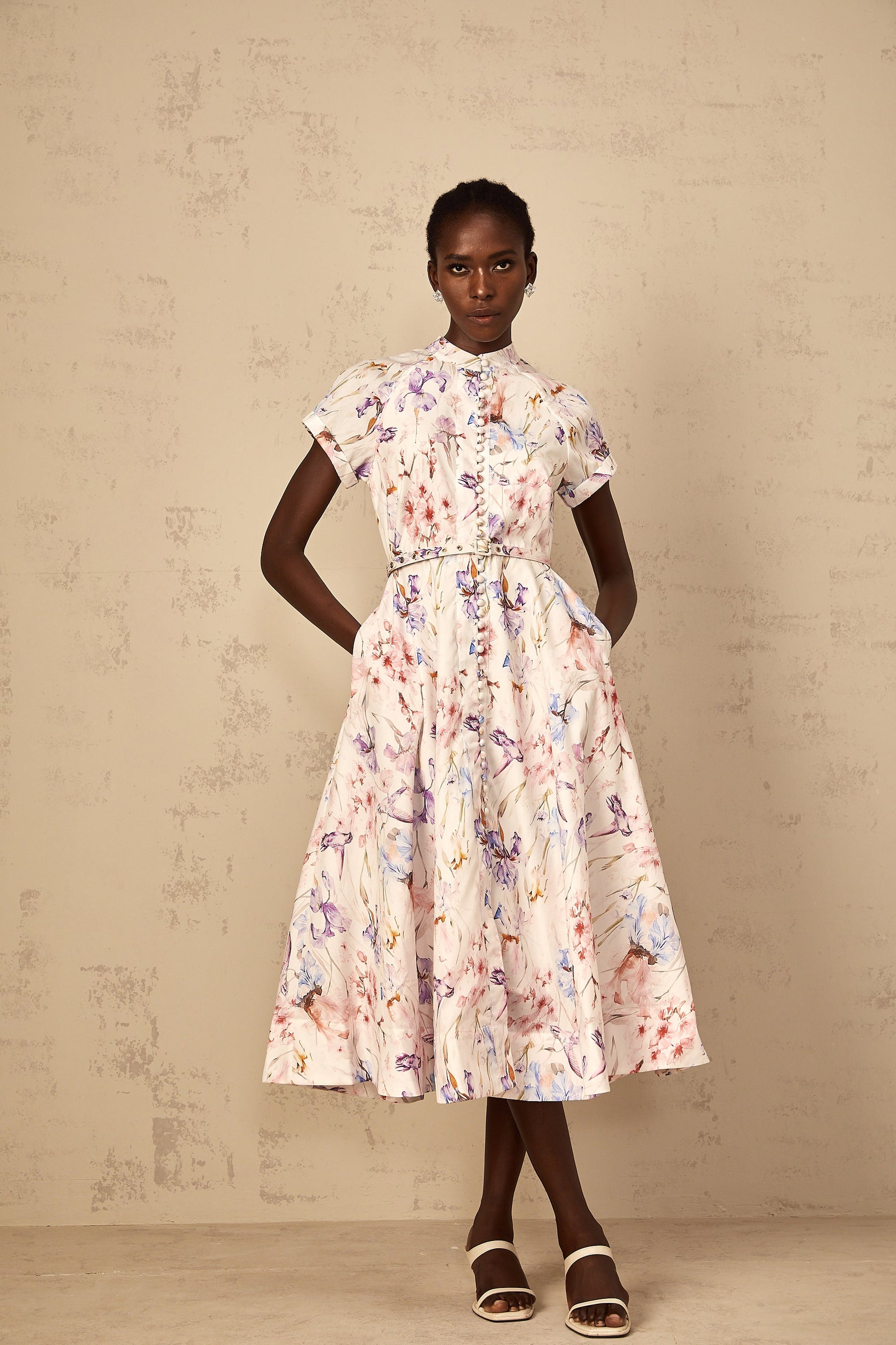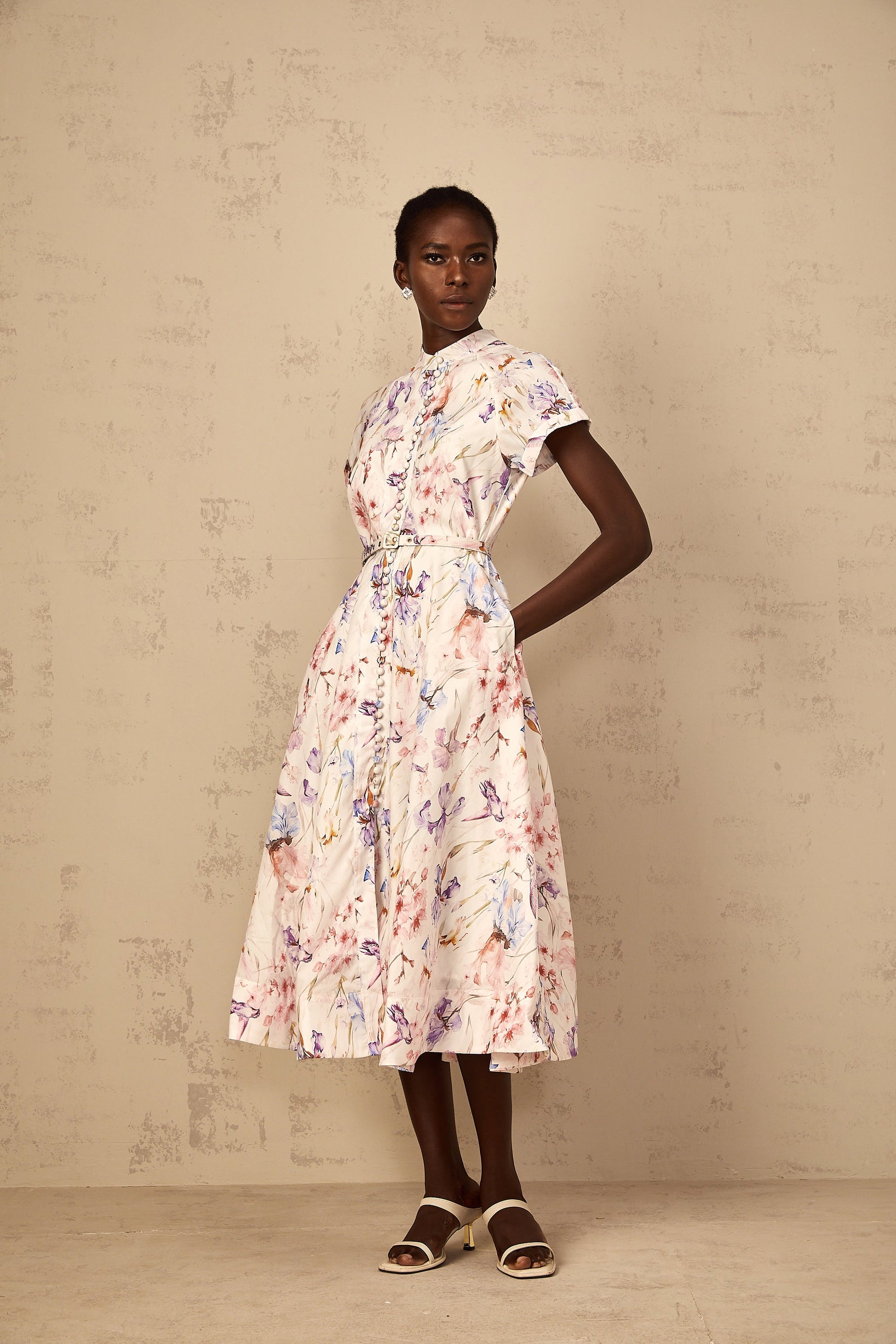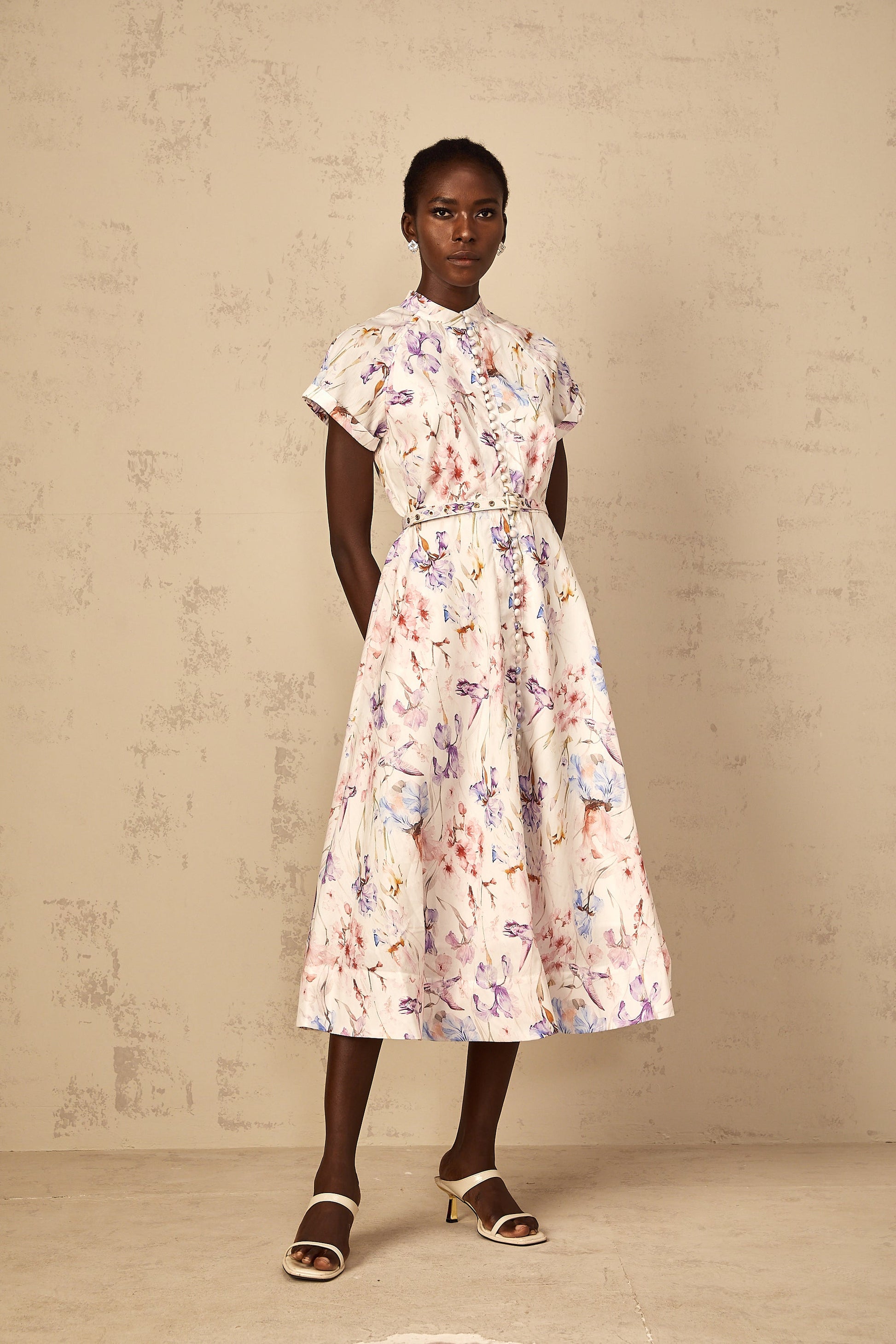 Géraldine White Mock-Neck Floral Print Midi Dress