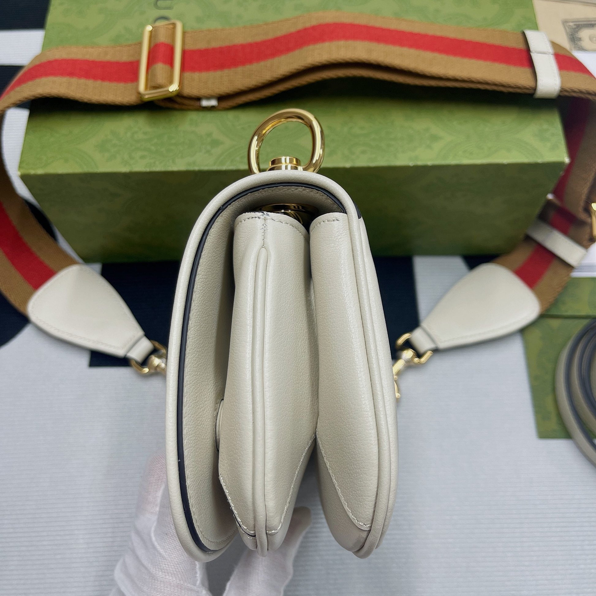 Coming from the House’s archives, a geometrically shaped version of the Interlocking G logo is reintroduced for GG Love Parade. The gold-toned hardware adds a defined vintage feel to the style, enriching the design with a timeless feel—mirroring the Hollywood glamour that shaped the fashion show. The white mini bag is completed by two interchangeable shoulder straps, in tonal the Web stripe.
