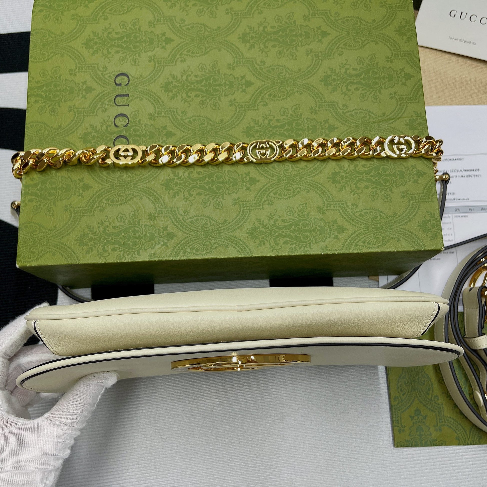 Coming from the House’s archives, a round shaped version of the Interlocking G logo is reintroduced for GG Love Parade. Crafted from white , this shoulder bag is completed by a delicate chain strap, infusing this accessory with a refined feel.