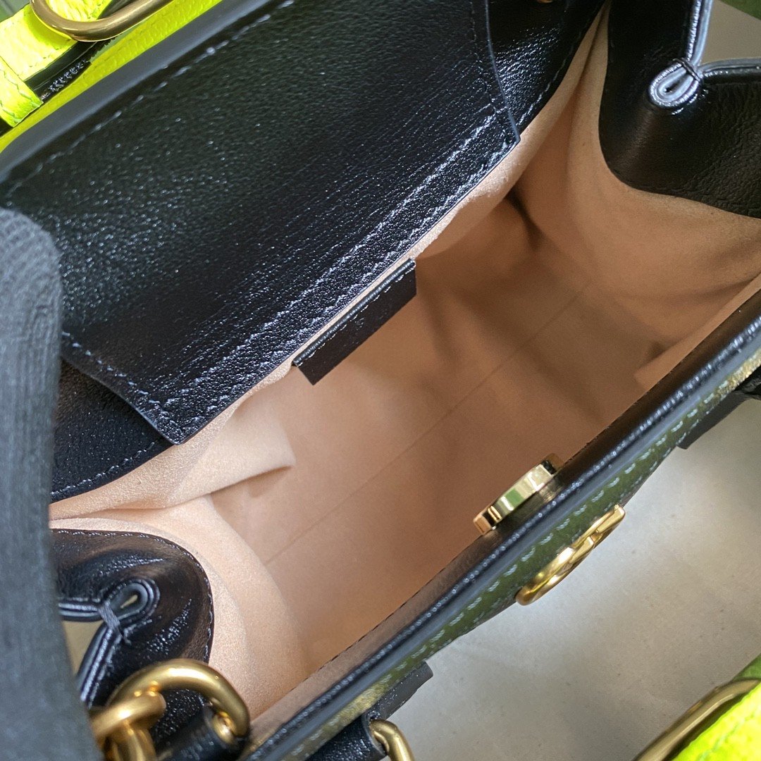 An evolution of a bamboo handle tote first introduced in 1991, the GG Diana represents the notion of style in constant evolution and is reimagined with removable, neon belts a nod to the functional bands used to keep the handles in shape. Here, a mini version of the emblematic style is presented in black