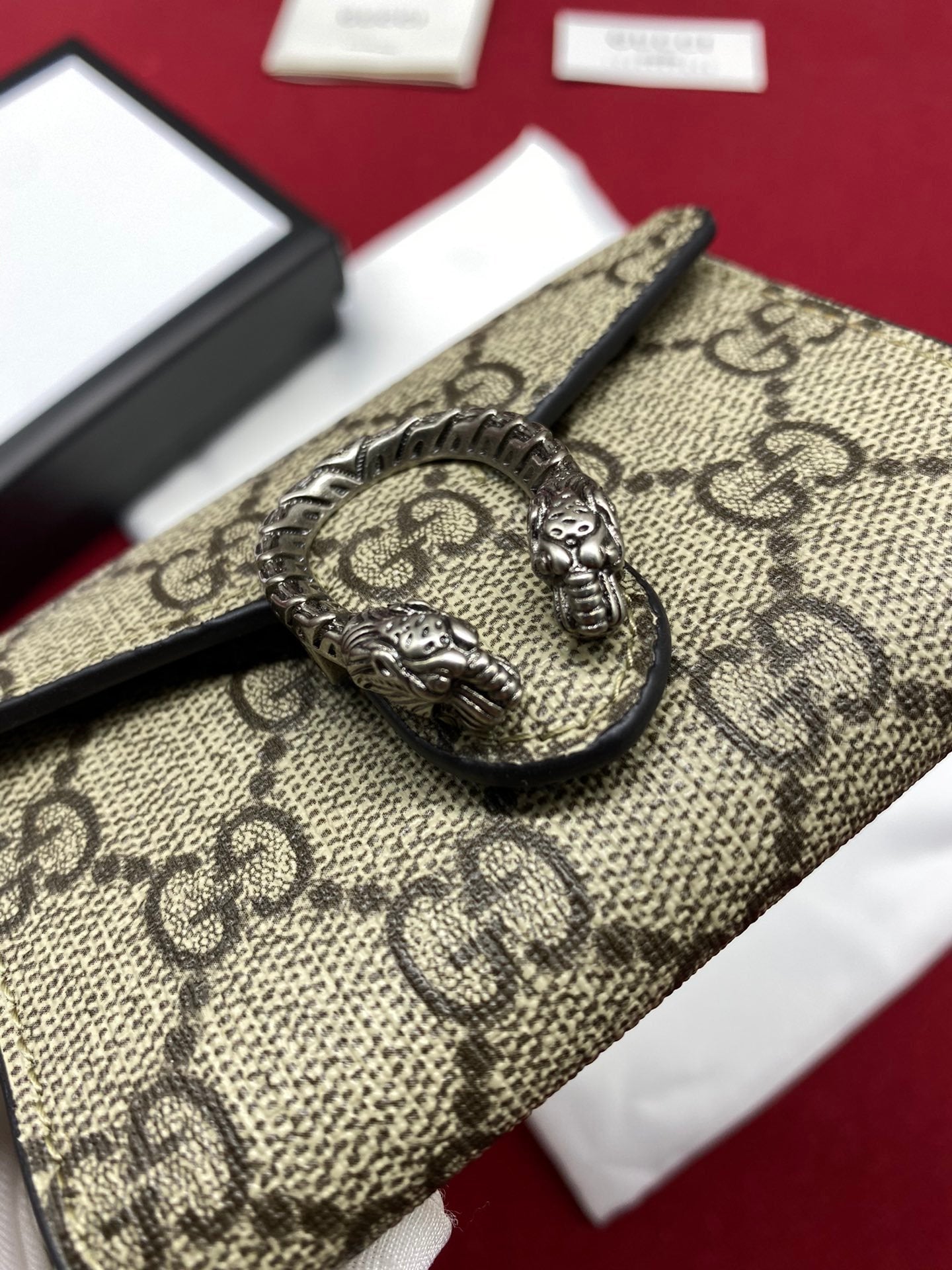 A structured GG Supreme canvas wallet on chain with our textured tiger head spur closure.