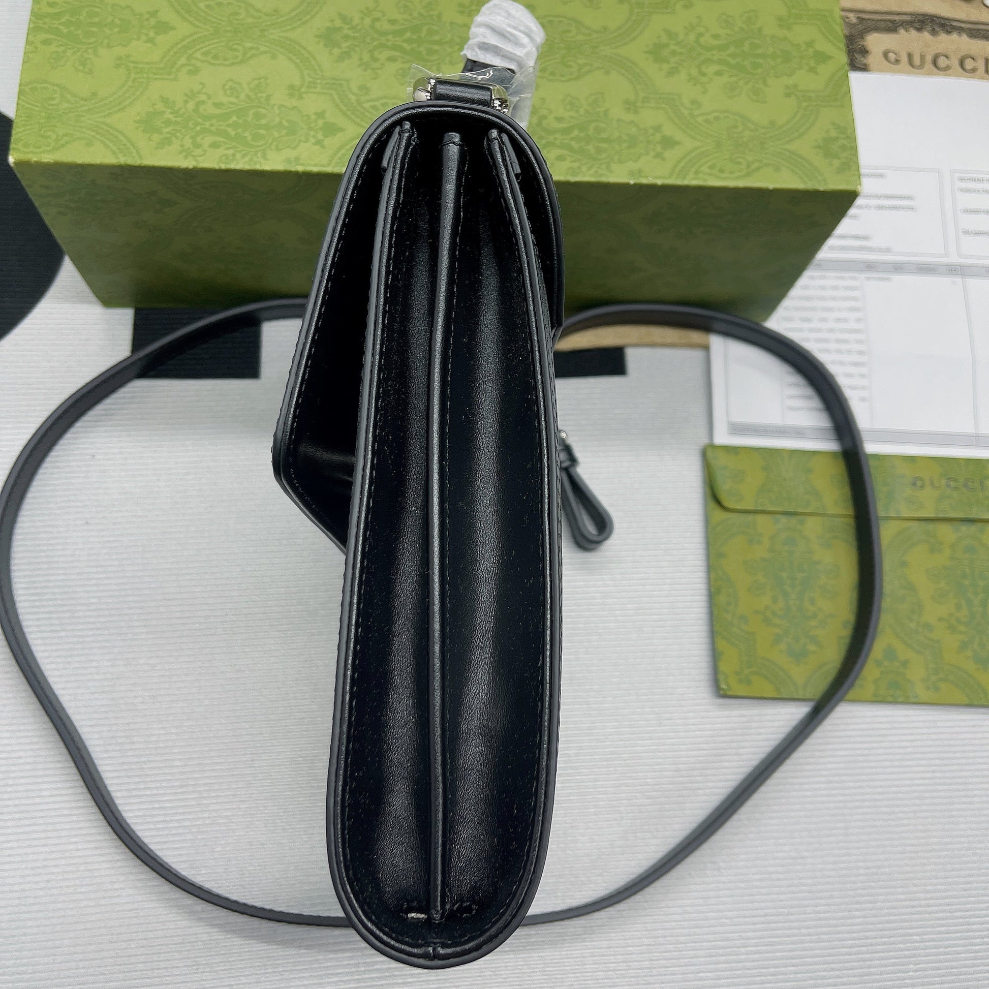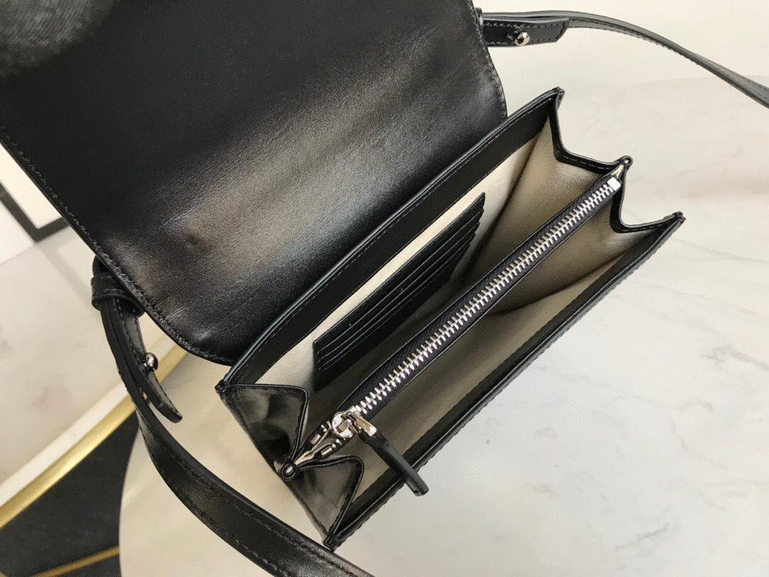 A new messenger shape with an adjustable shoulder strap and additional top handle is equipped with an organized interior including multiple compartments and card slots. Crafted from black GG noted for its softness and slightly shiny finish. Introduced within the Pre-Fall 2020 collection, the plays with texture, embossing the House emblem onto a perforated base.