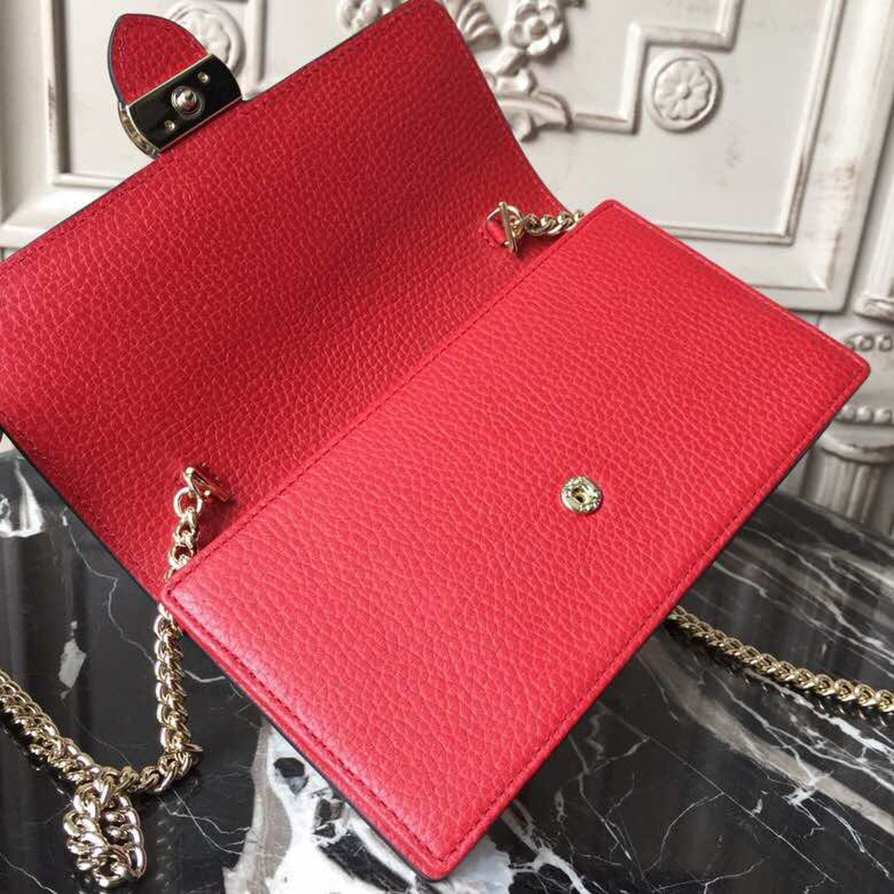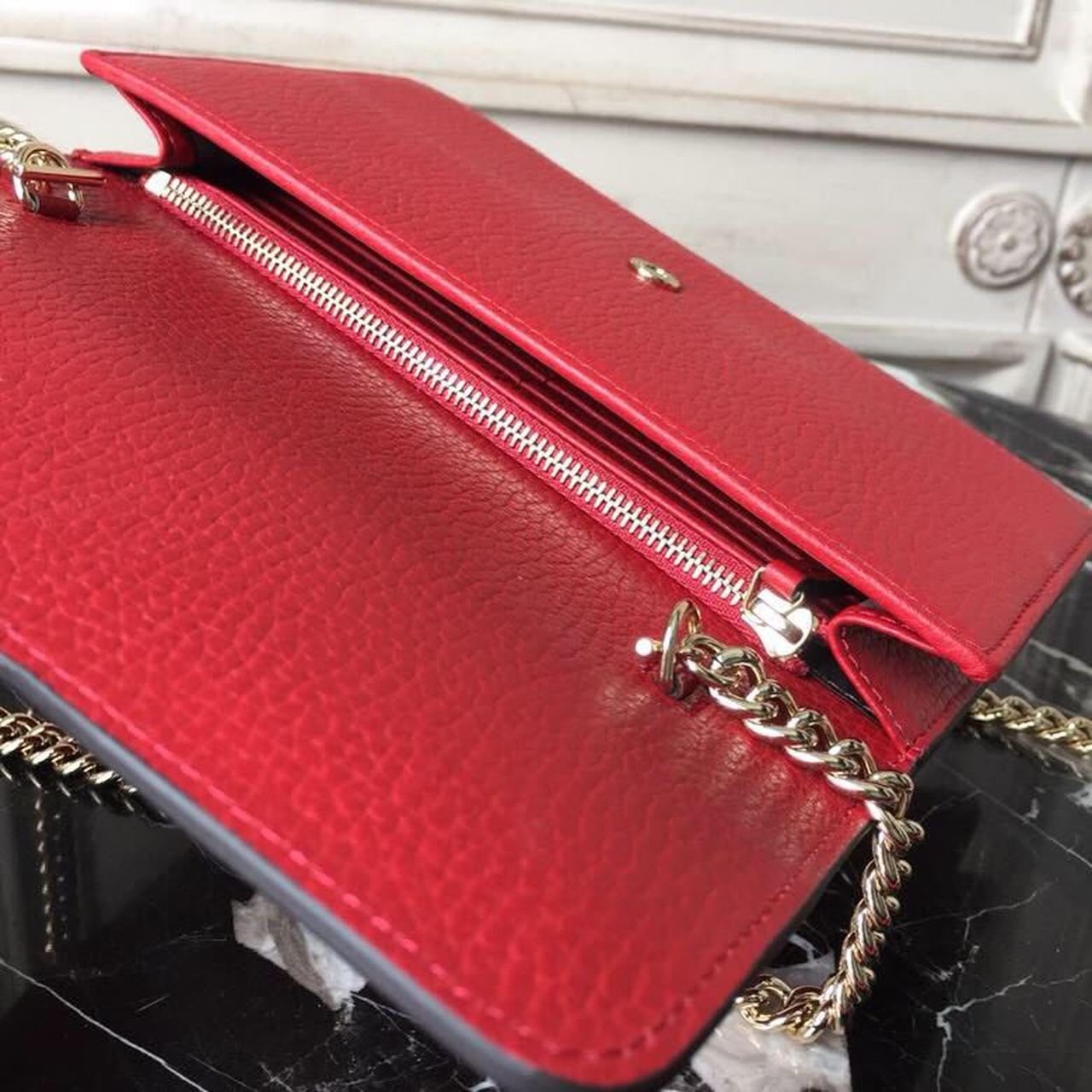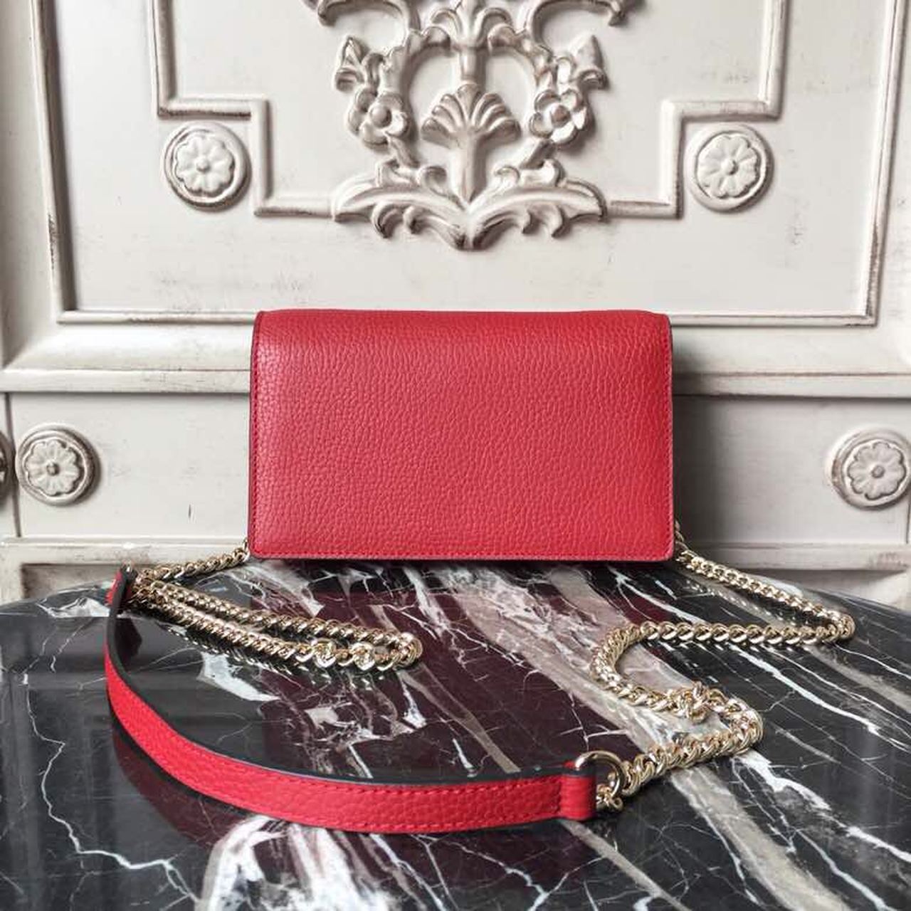 Red Calf Leather Golden Interlocking GG Hardware Golden Chain and Leather Crossbody Strap with a 22″ Drop Flap Close with Interlocking GG Snap Interior Open Pocket Fully Lined