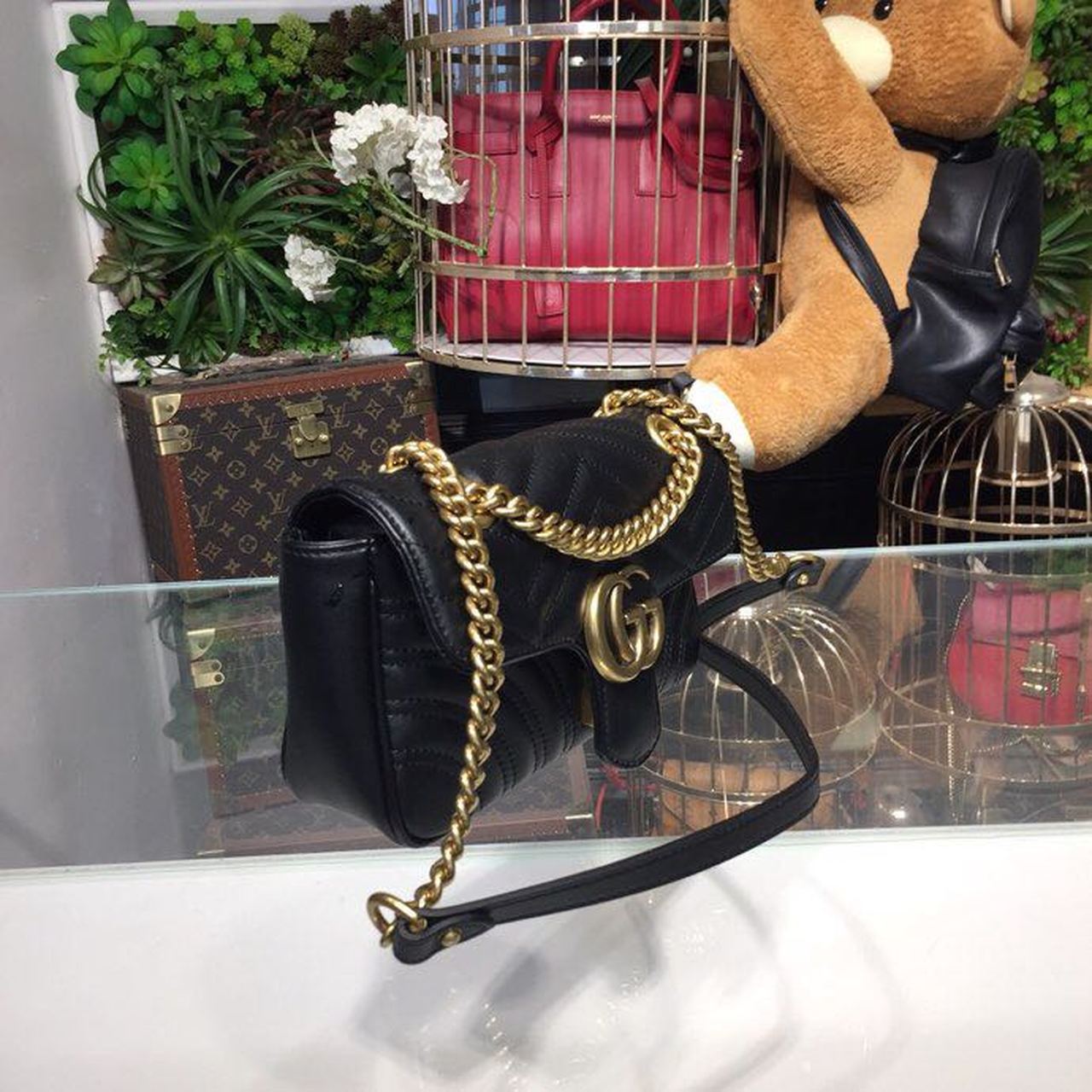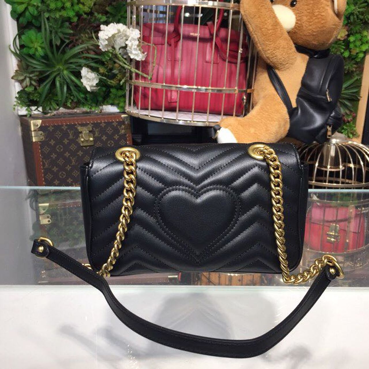 The small GG Marmont chain shoulder bag has a softly structured shape and an oversized flap closure with Double G hardware. The sliding chain strap can be worn multiple ways, changing between a shoulder and a top handle bag. Made in matelassé chevron with a heart on the back.