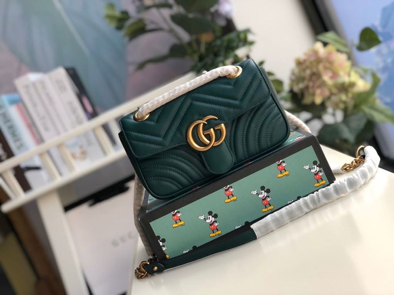 The mini GG Marmont chain shoulder bag has a softly structured shape and an oversized flap closure with Double G hardware. The sliding chain strap can be worn multiple ways, changing between a shoulder and a top handle bag. Made in matelassé chevron with a heart on the back.