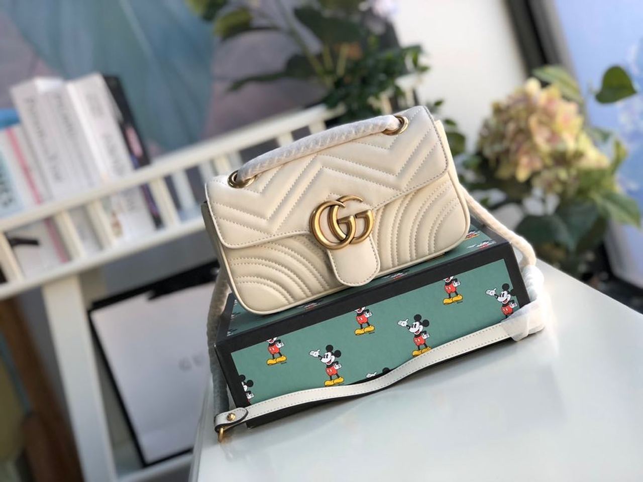 The mini GG Marmont chain shoulder bag has a softly structured shape and an oversized flap closure with Double G hardware. The sliding chain strap can be worn multiple ways, changing between a shoulder and a top handle bag. Made in matelassé chevron with a heart on the back.