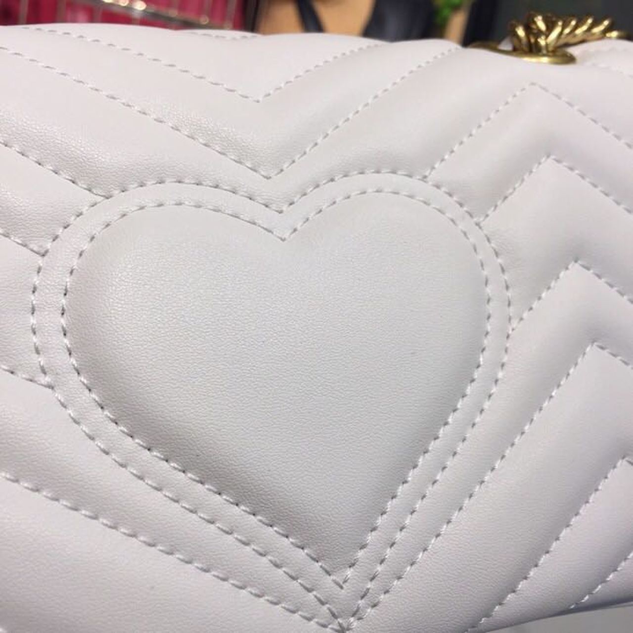 The small GG Marmont chain shoulder bag has a softly structured shape and an oversized flap closure with Double G hardware. The sliding chain strap can be worn multiple ways, changing between a shoulder and a top handle bag. Made in matelassé chevron with a heart on the back.