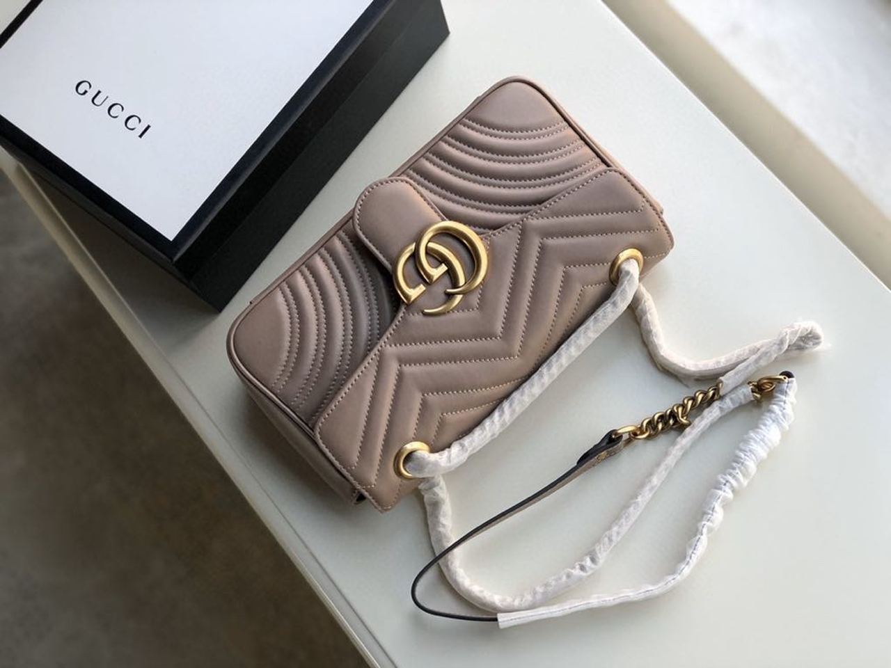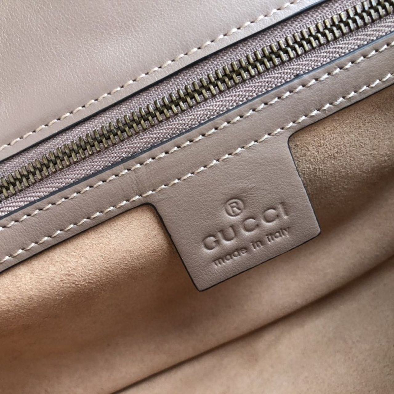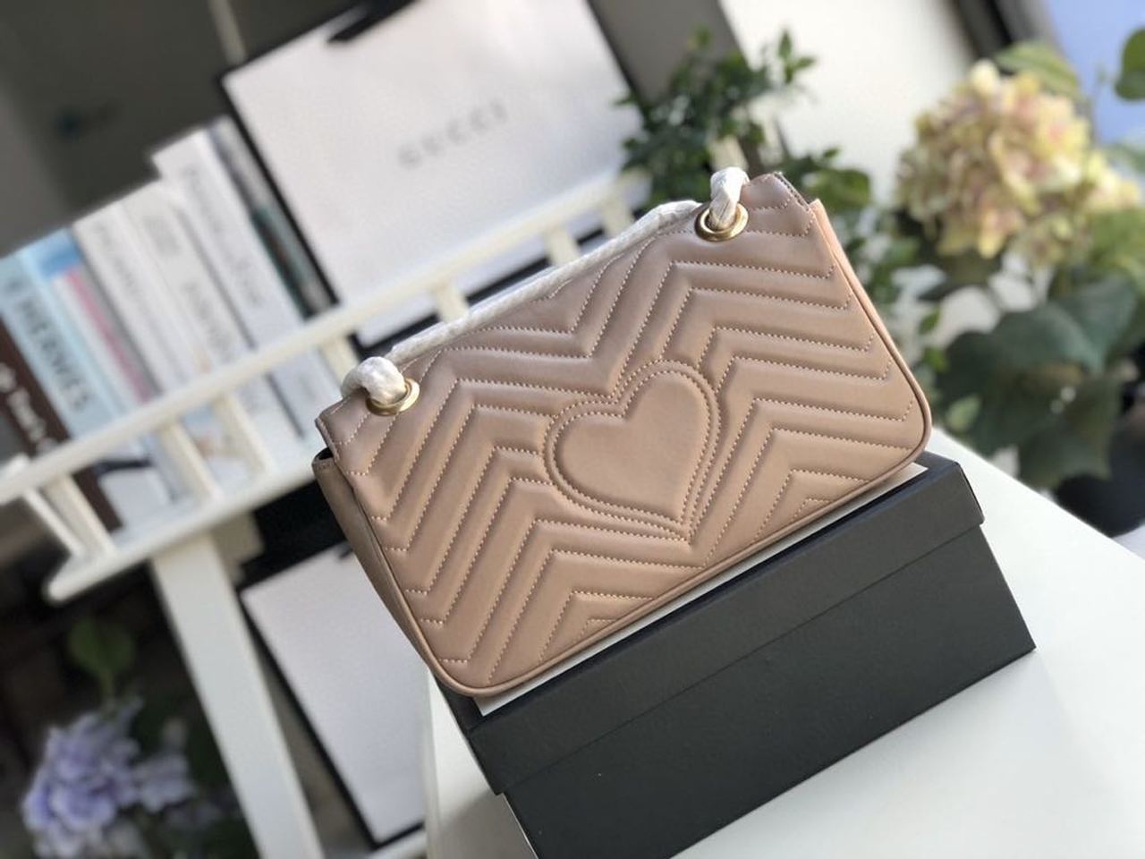The small GG Marmont chain shoulder bag has a softly structured shape and an oversized flap closure with Double G hardware. The sliding chain strap can be worn multiple ways, changing between a shoulder and a top handle bag. Made in matelassé chevron with a heart on the back.
