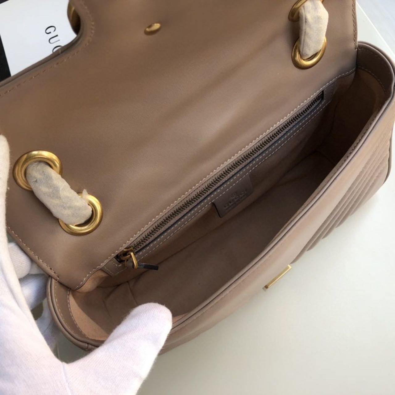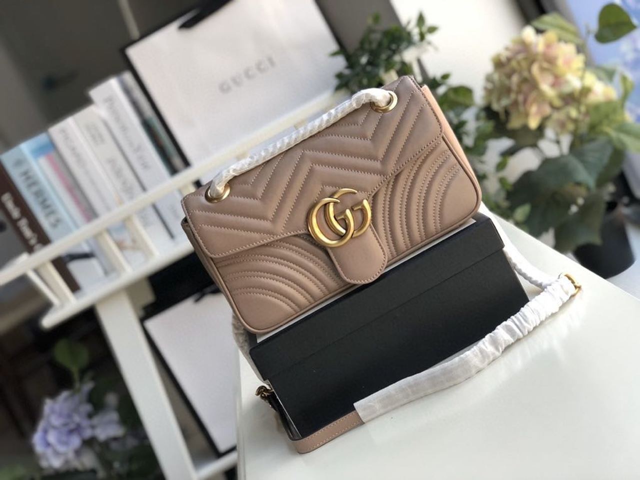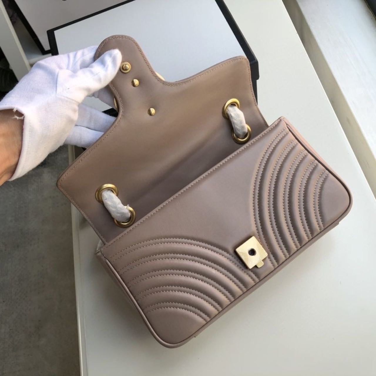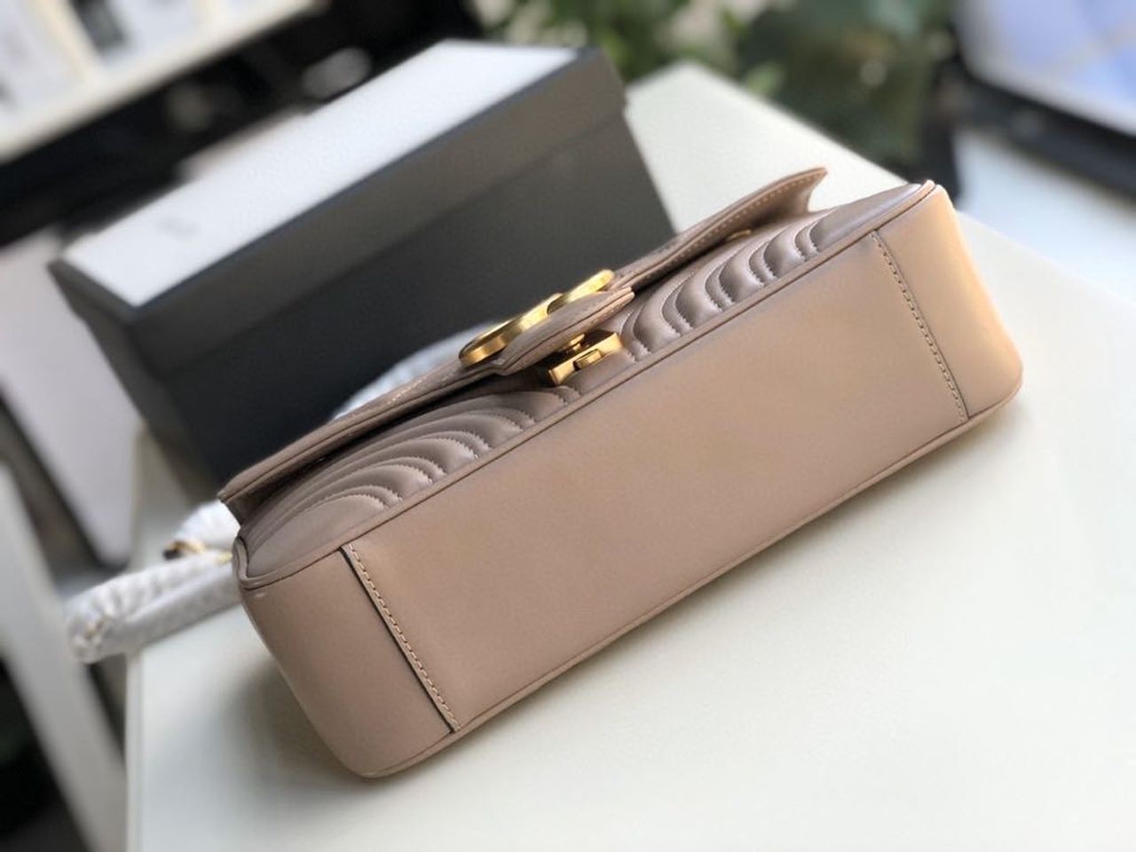 The small GG Marmont chain shoulder bag has a softly structured shape and an oversized flap closure with Double G hardware. The sliding chain strap can be worn multiple ways, changing between a shoulder and a top handle bag. Made in matelassé chevron with a heart on the back.