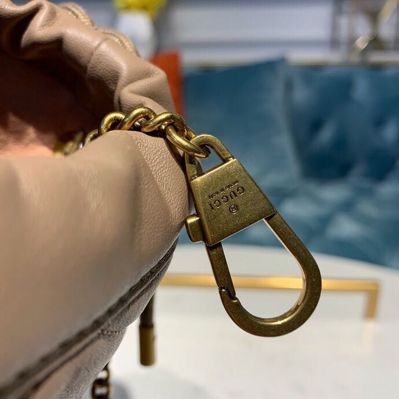 A mini bucket bag presented in beige matelassé with a heart detail on the back. The GG Marmont collection is defined by the emblematic Double G hardware a contemporary take on a gg archival belt buckle from the ’70s that has become a hallmark of the House. Completed by a gold-toned chain strap, the dynamic shape can be worn in multiple ways.