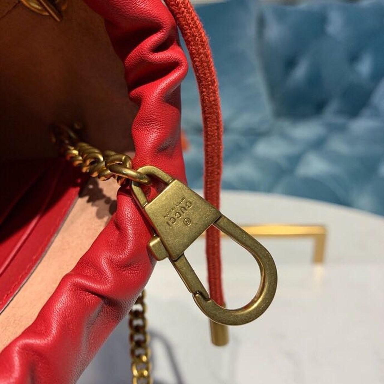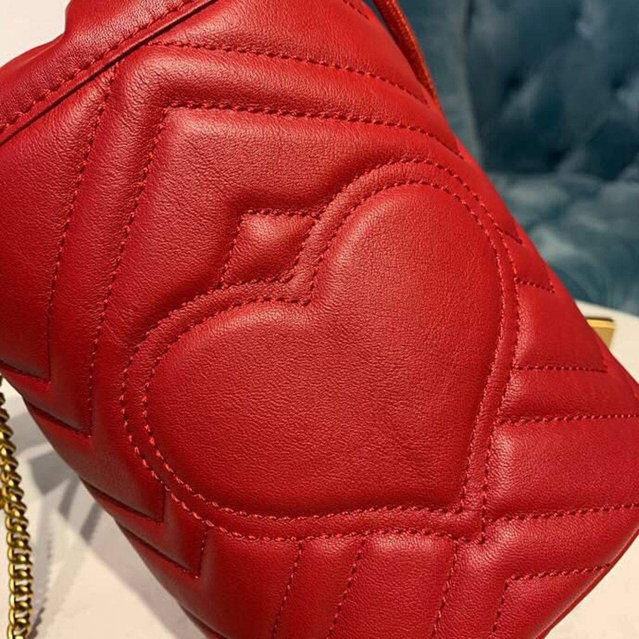 A mini bucket bag presented in hibiscus red matelassé with a heart detail on the back. The GG Marmont collection is defined by the emblematic Double G hardware a contemporary take on a gg archival belt buckle from the ’70s that has become a hallmark of the House. Completed by a gold-toned chain strap, the dynamic shape can be worn in multiple ways.