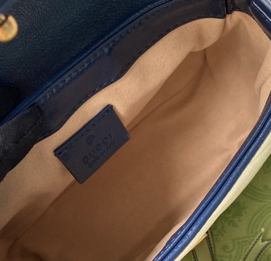 A new introduction to the GG Marmont line for Cruise 2019, the mini GG Marmont top handle bag has a softly structured shape and an oversized flap closure with Double G hardware. Equipped with a leather top handle and chain shoulder strap, made in matelassé chevron leather with a heart on the back.