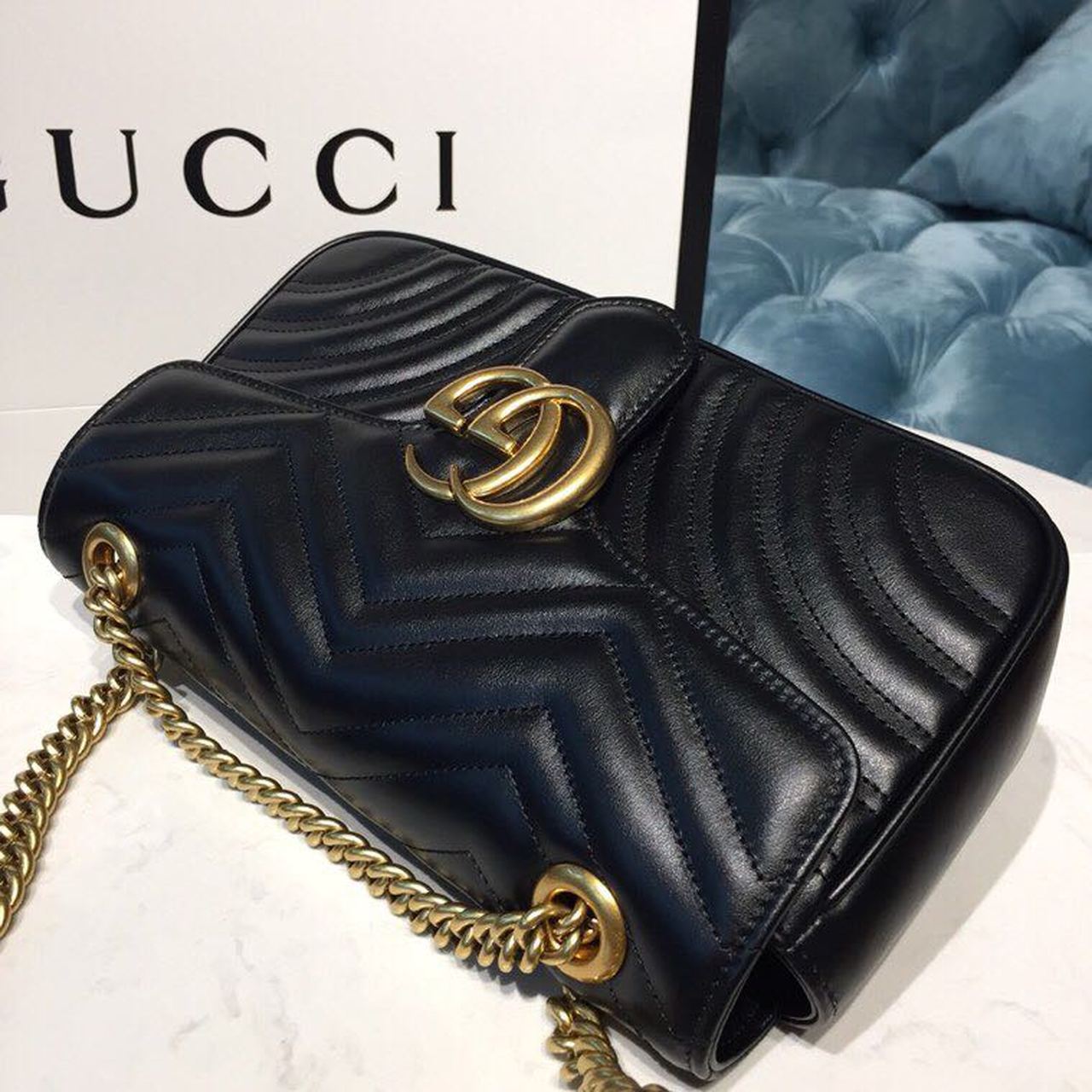 The small GG Marmont flap bag has a softly structured shape and an flap closure with Double G hardware. The sliding chain strap can be worn multiple ways, changing between a shoulder and a top handle bag. Made in matelassé chevron with a heart on the back.