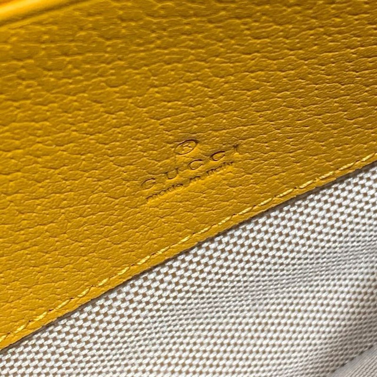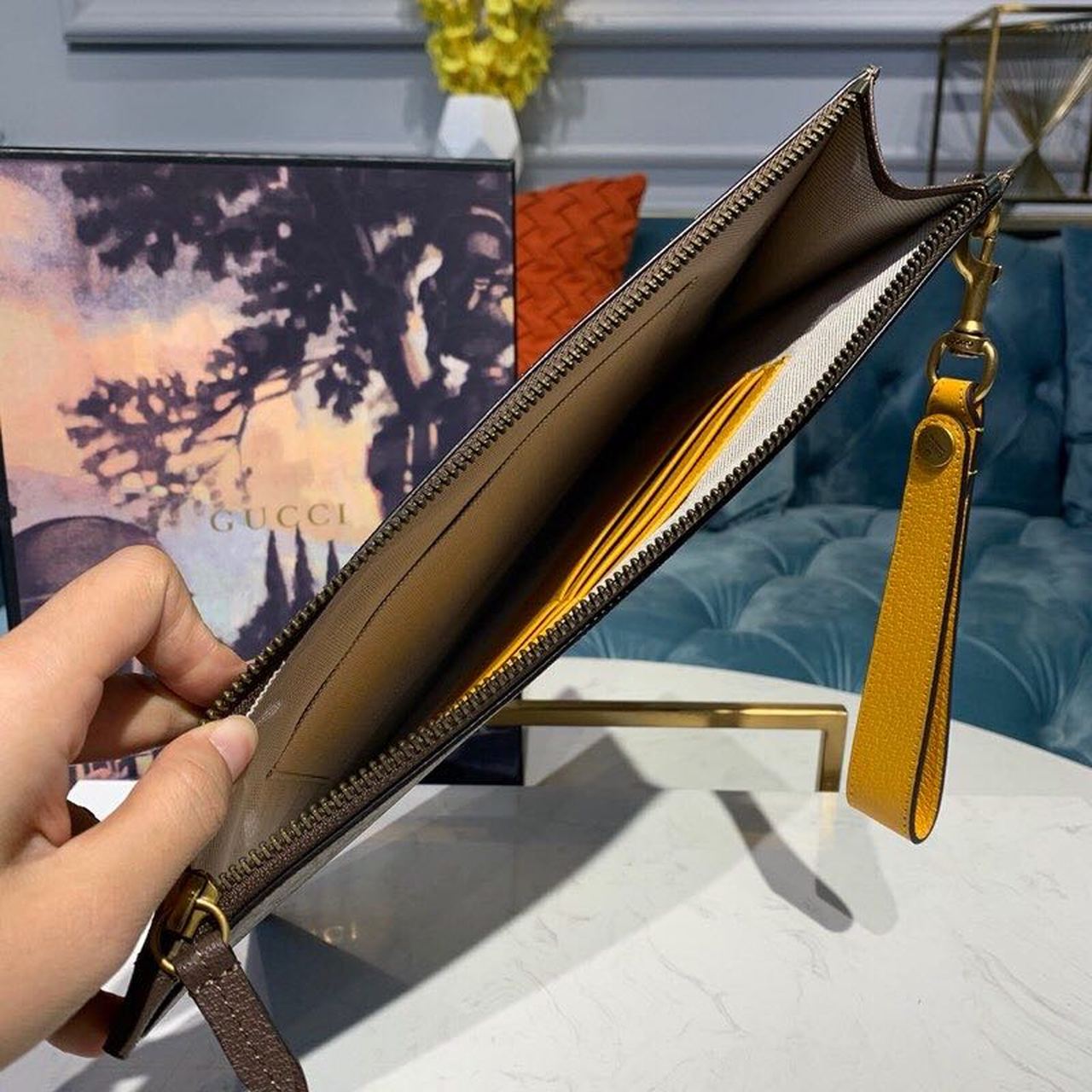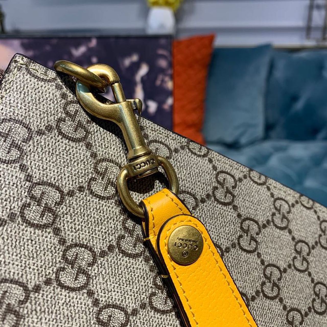 A collection of vintage inspired accessories in GG Supreme feature an oval leather tag with metal feline head. The removable wrist strap of this slim pouch is in yellow