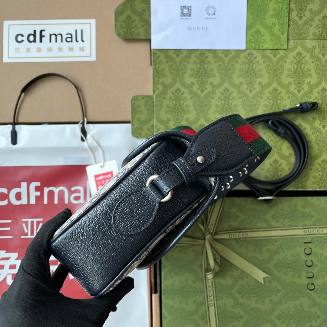 The Ophidia bag is reinvented in new and unexpected ways. The perforations and rivets recall the scene of punk culture and adorn the historical design to provide a unique version of this archival style. Crafted from the House’s signature GG Supreme , this extra-small shoulder bag is crafted in a traditional blend of beige and ebony, providing a playful contrast.