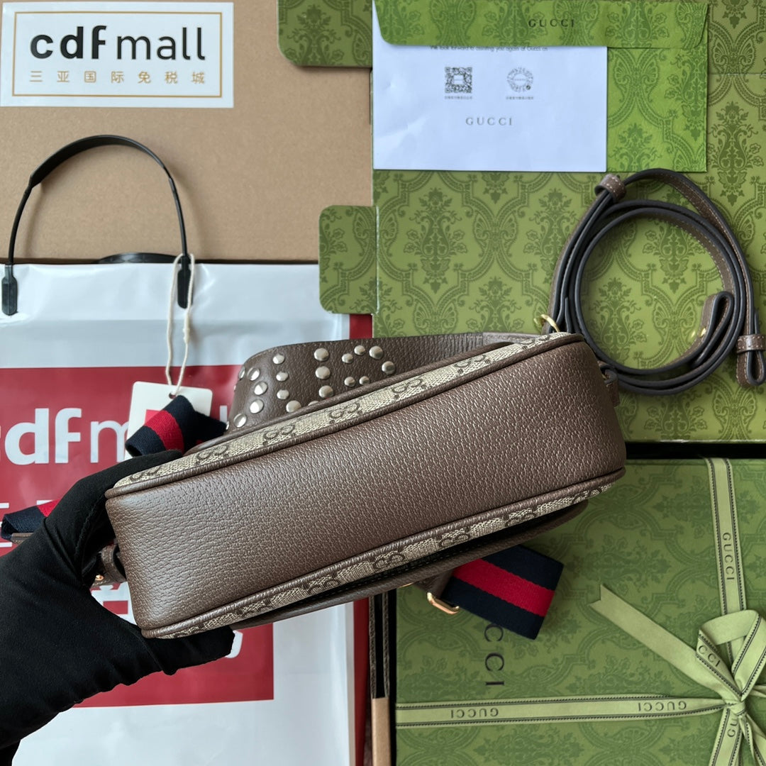 The Ophidia bag is reinvented in new and unexpected ways. The perforations and rivets recall the scene of punk culture and adorn the historical design to provide a unique version of this archival style. Crafted from the House’s signature GG Supreme , this extra-small shoulder bag is crafted in a traditional blend of beige and ebony, providing a playful contrast.