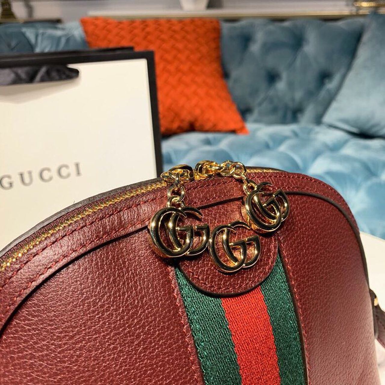 Crafted in GG with inlaid Web stripe detail, the shoulder bag has a domed shape that recalls vintage designs. The Double G an archival code appears atop tab detail and on the zipper pull.