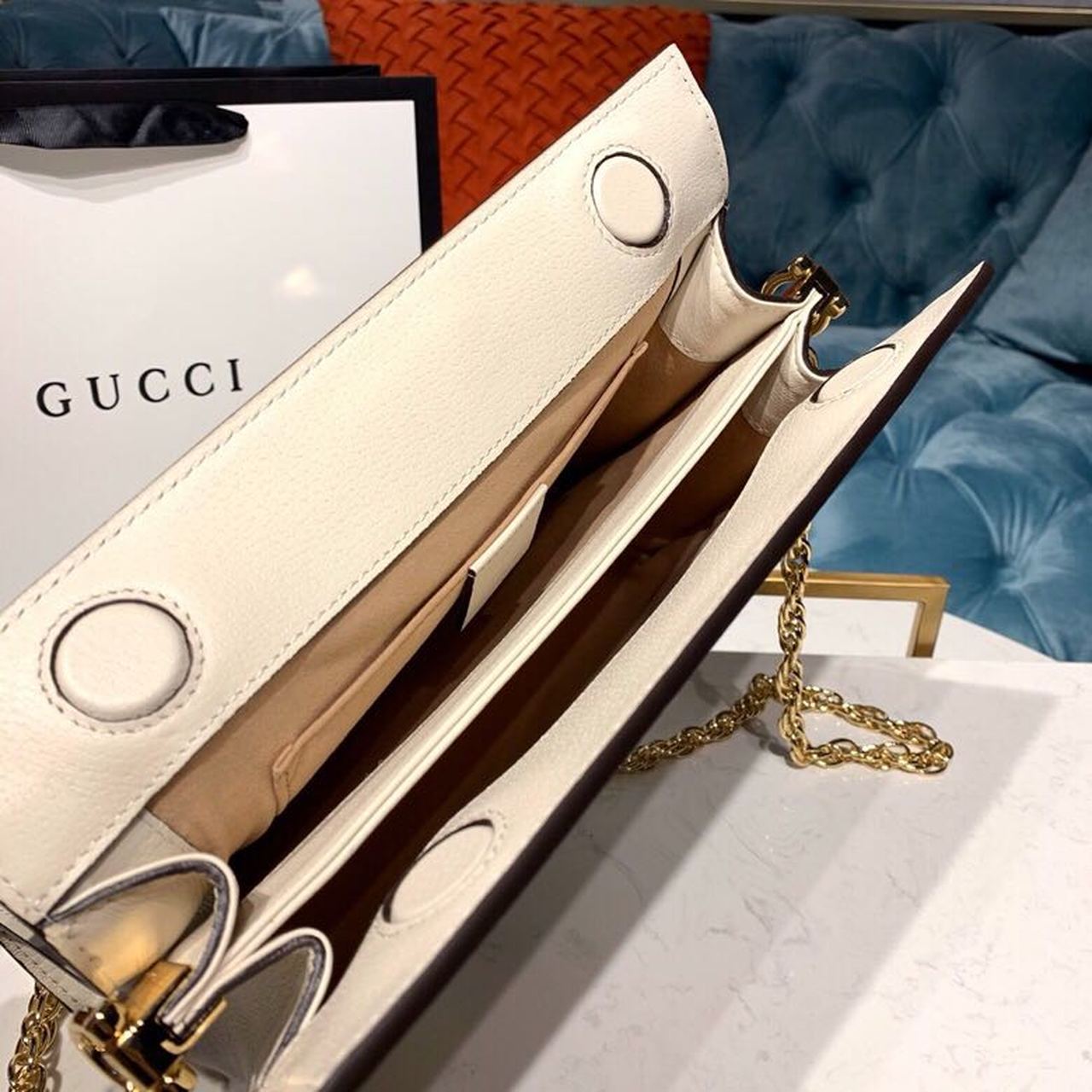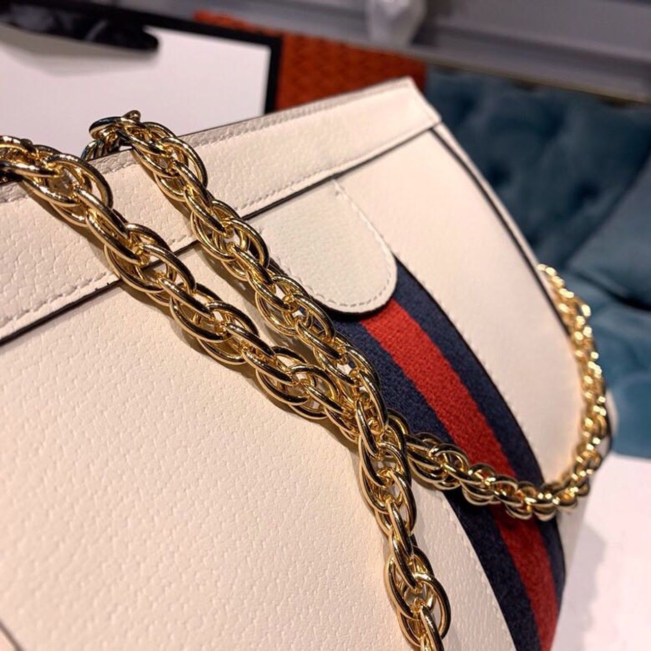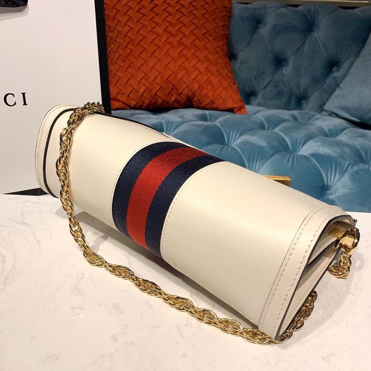 Within GG Aria the world of Ophidia evolves with new iterations, combining vintage inspired details with emblematic House codes. This small shoulder bag is from white, with a distinctive white trim and inlaid blue and red Web stripe. The vintage influenced structured design is completed by a chain strap and Double G hardware.