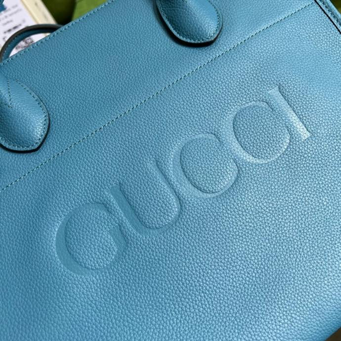 Subtle logo touches add a minimalist feel to classic shapes and silhouettes. Here, this blue leather tote bag is defined by an embossed version of the GG logo.