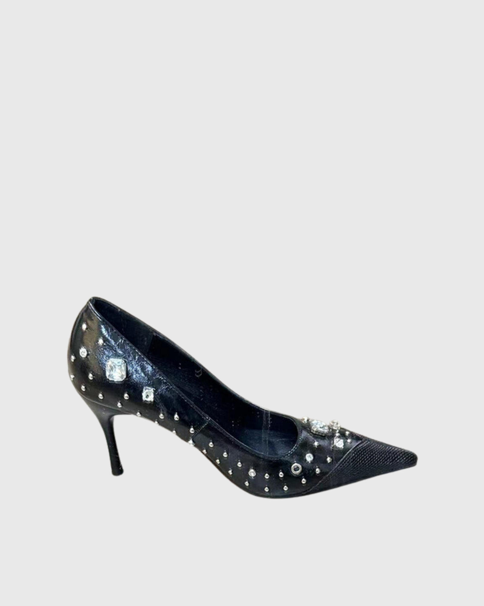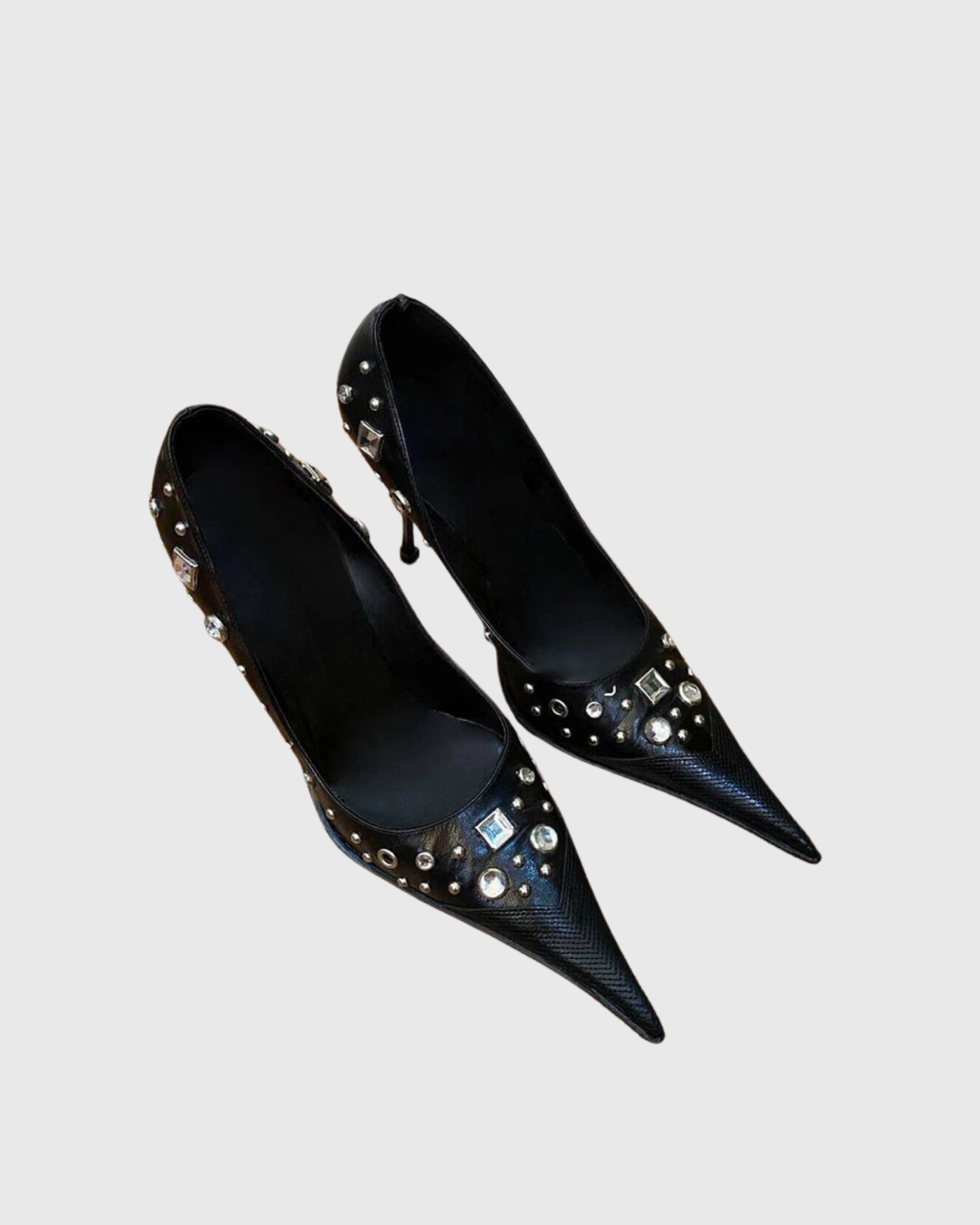 Elevate your style with our Grace Rhinestone Rivet Pumps In Black! Featuring stunning rhinestone embellishments and edgy rivet details, these pumps will add a touch of glamour to any outfit. Walk with confidence and turn heads with these statement shoes. Perfect for both elegant and edgy looks.