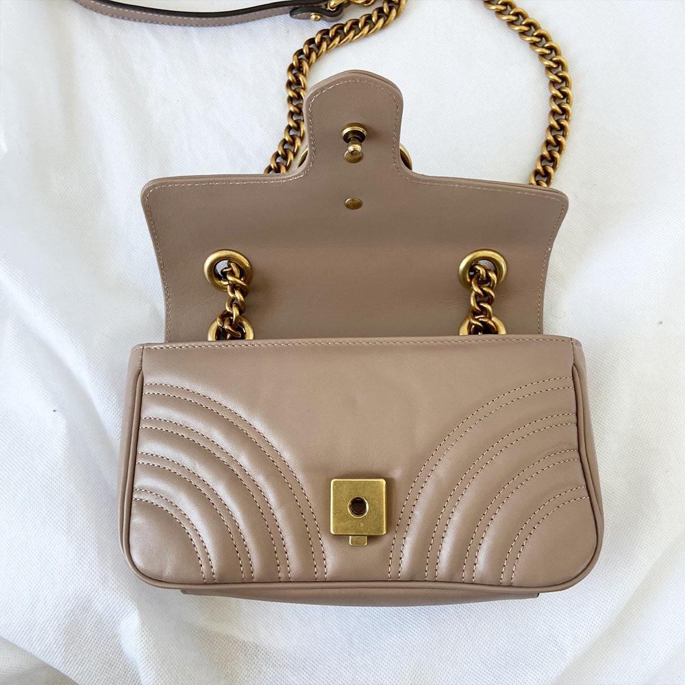 Description : Gucci mini dusty pink GG marmont 2.0 shoulder bag matelasse, lined with suede and one open pocket.