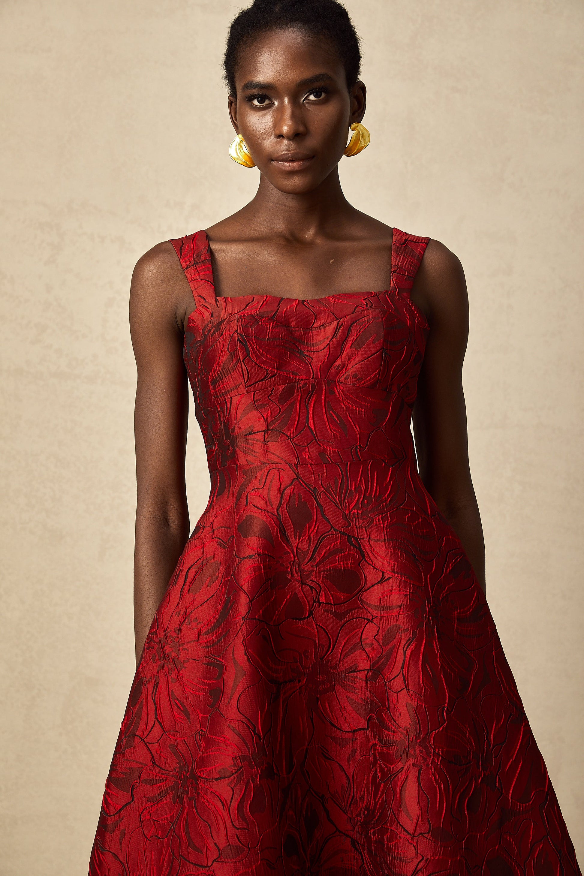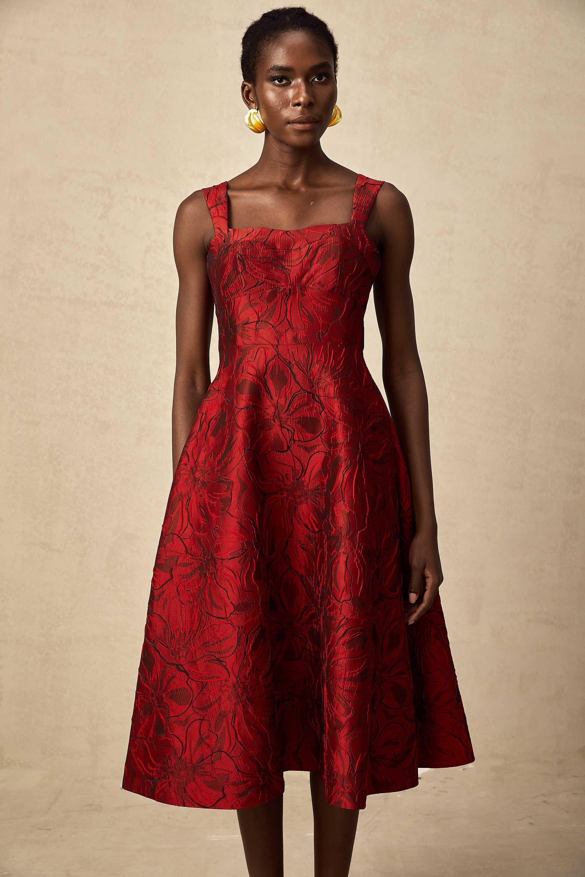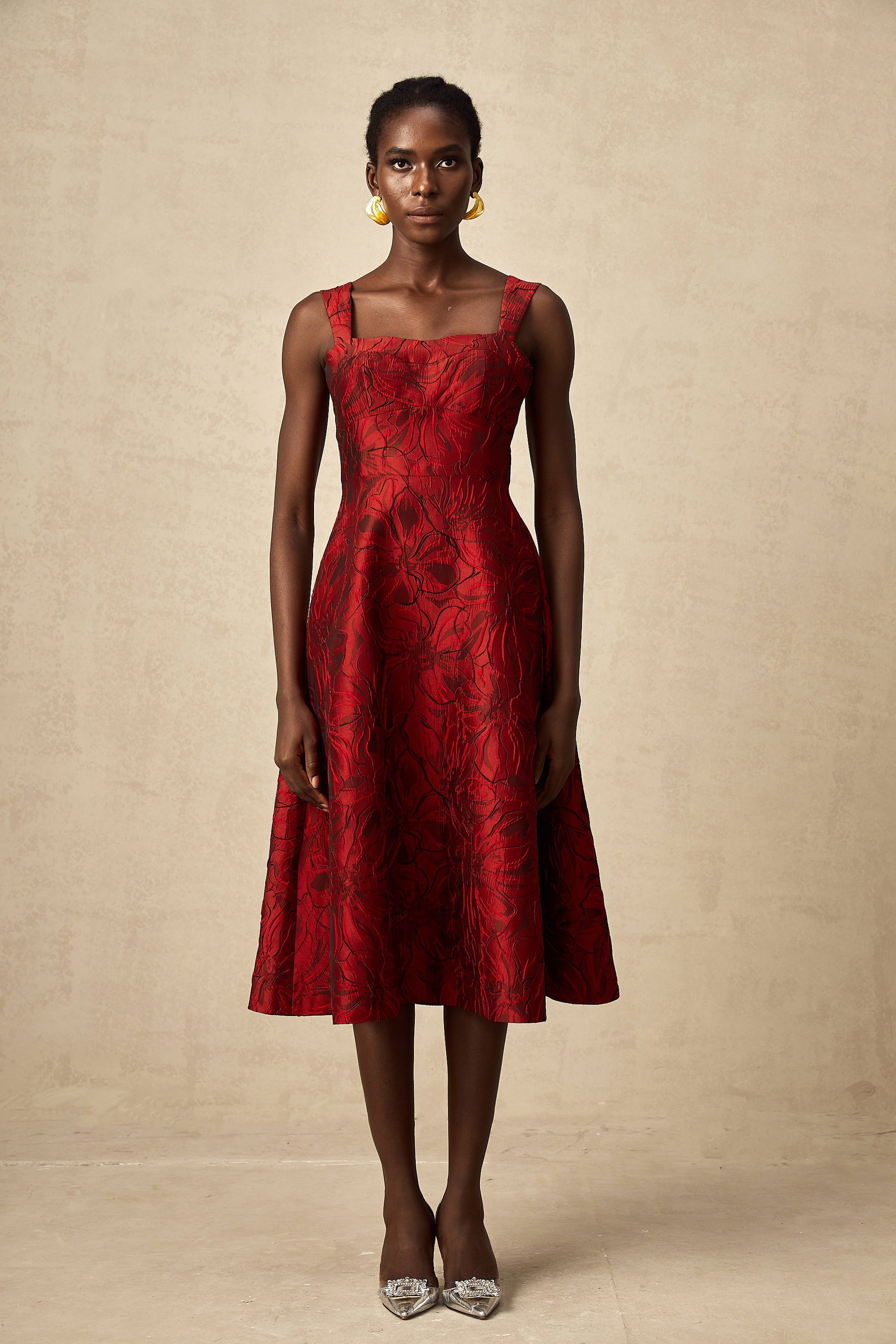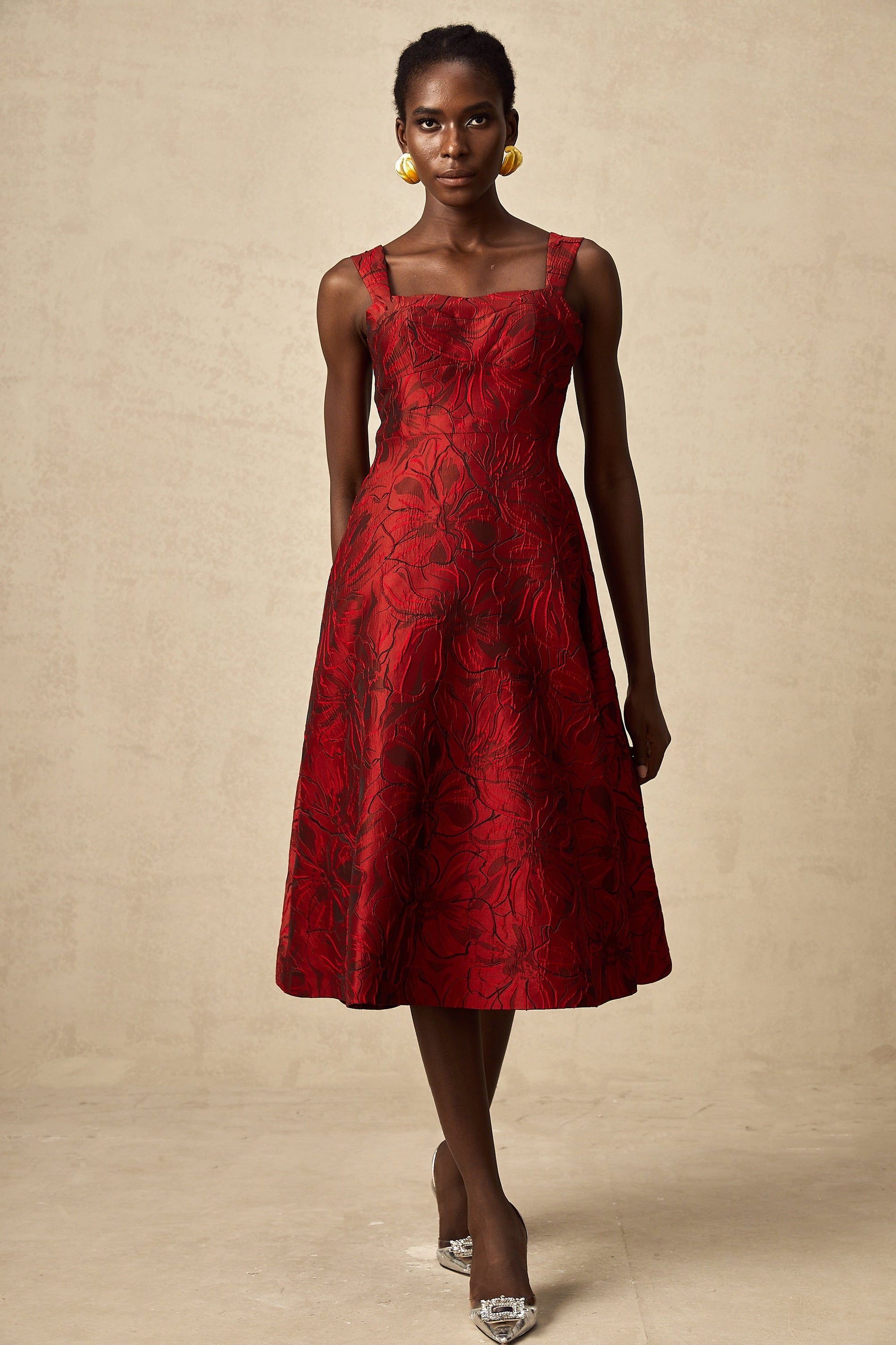 Hélène red floral-jacquard midi dress
