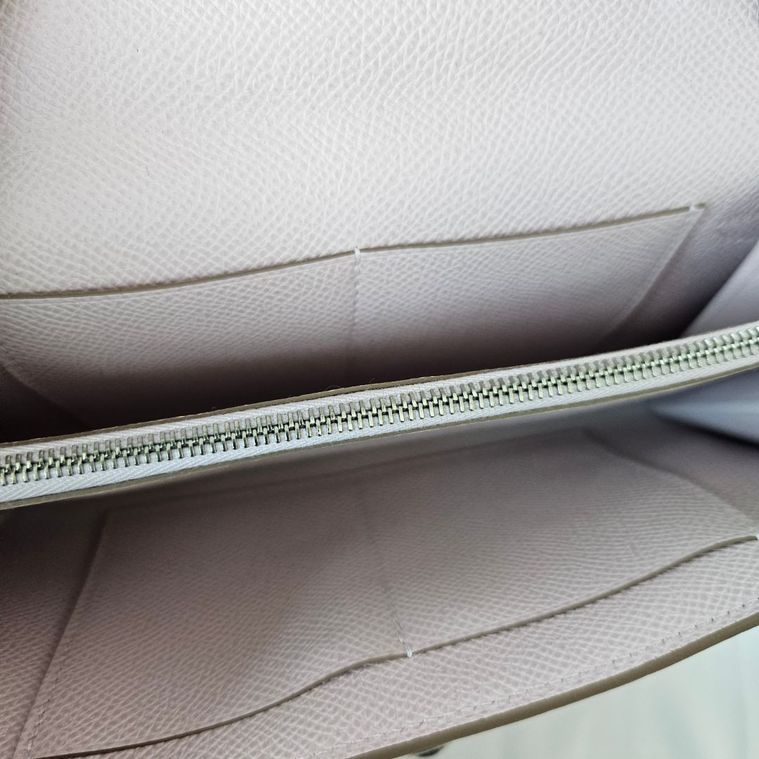 Hermès Kelly to go Mauve Pale crafted of epsom leather, this chic wallet is crafted of fine epsom calfskin leather in light pink with a palladium plated frontal flap, strap, and turn lock. This opens to a matching leather interior lined with card slots, patch pockets, and a zipper pocket.