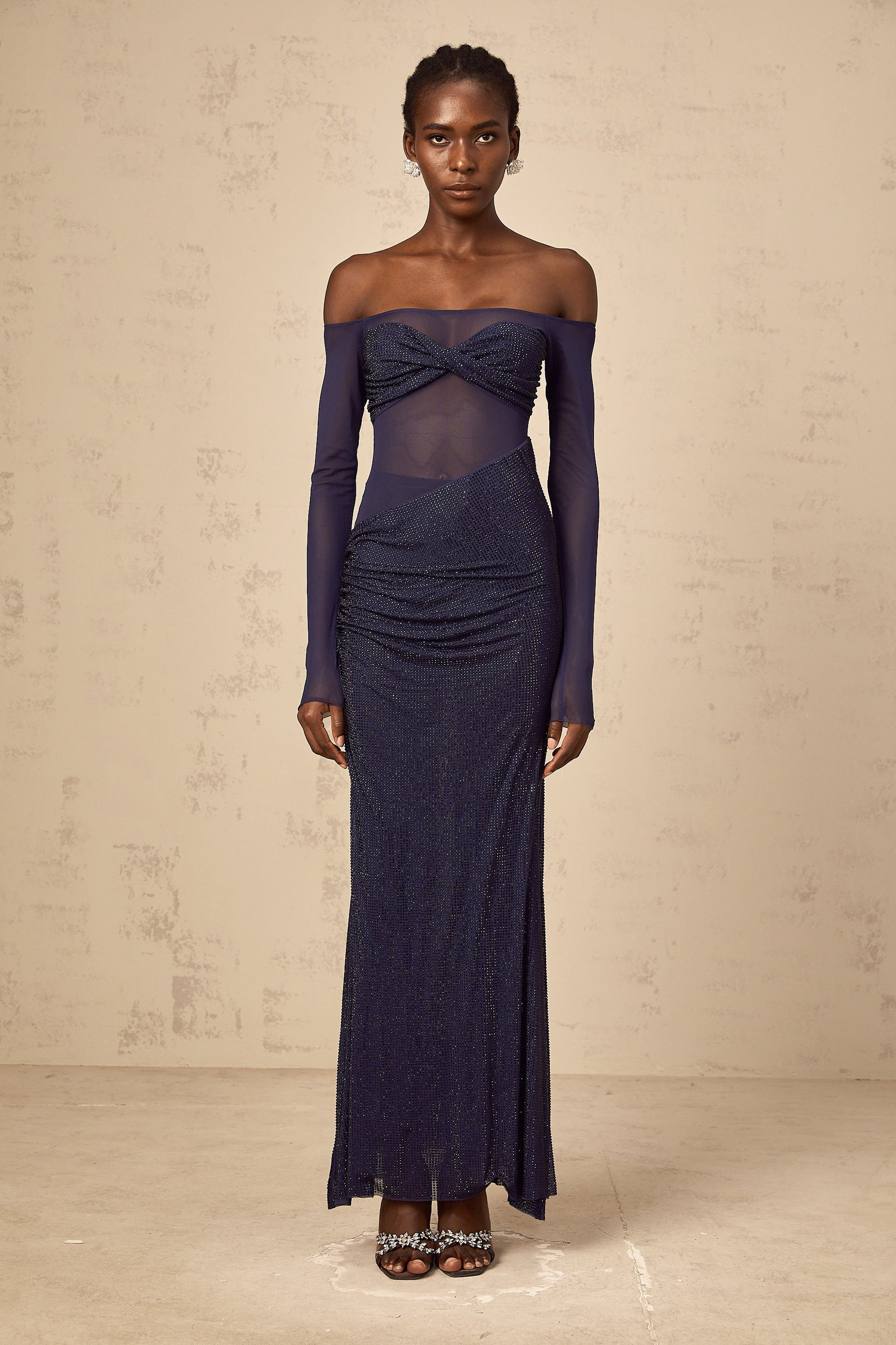Hermine dark-blue embellished tulle-panel corset maxi dress