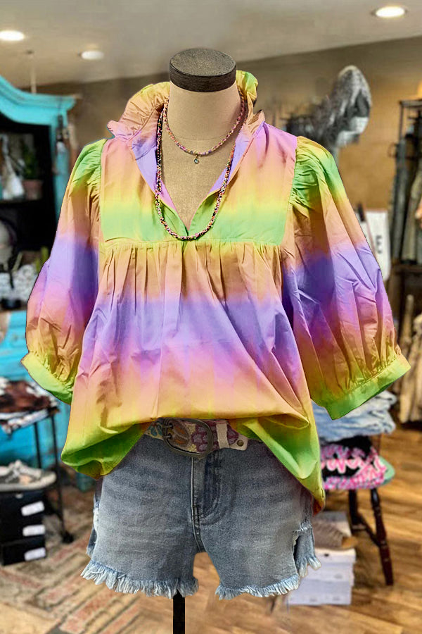 Cute Mardi Gras Tie Dye Puff Sleeve Blouse