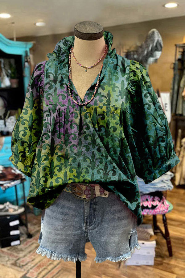 Unique Mardi Gras Print Puff Sleeve Blouse