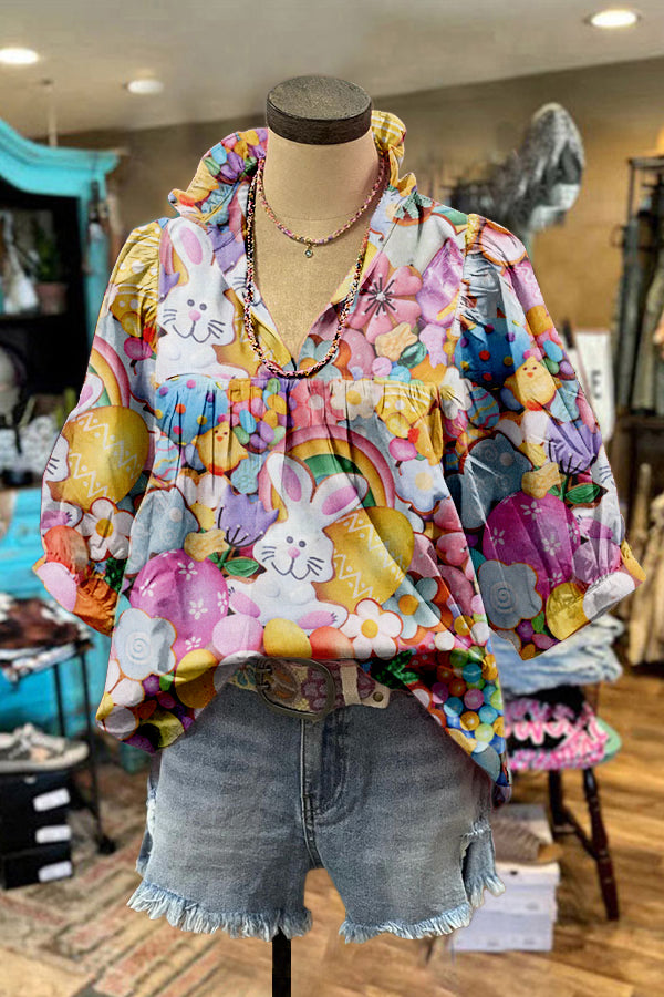Cute Bunny Easter Egg Print Puff Sleeve Blouse