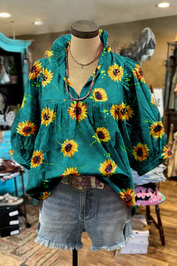 Stylish Sunflower Floral Print Puff Sleeve Blouse