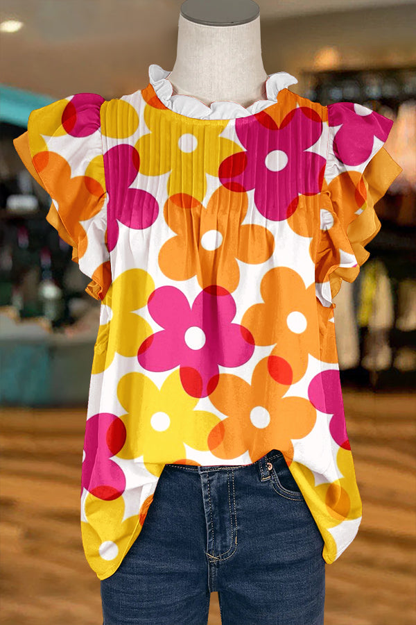 Pretty Floral Ruffled Sleeve Paneled Pleated Blouse