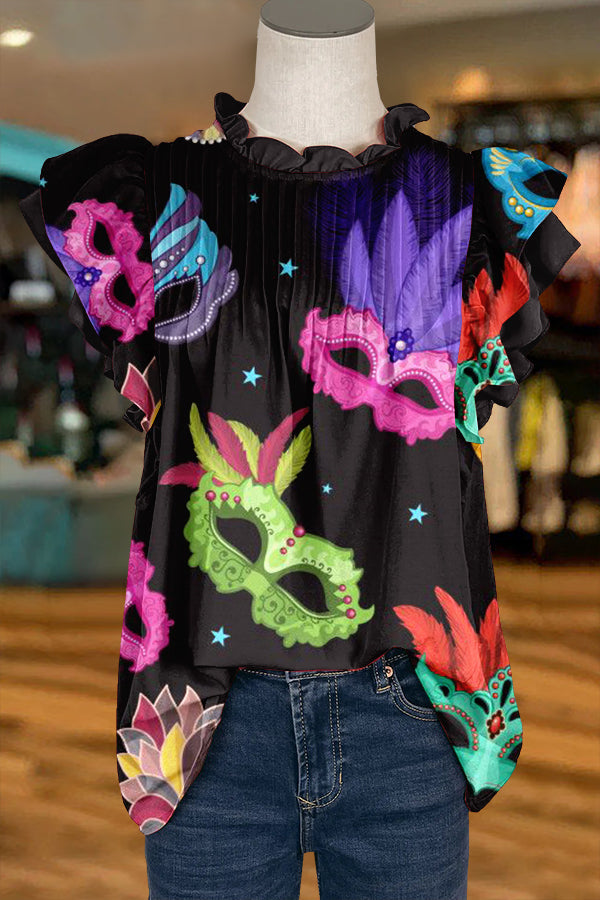 Chic Mardi Gras Ruffled Sleeve Paneled Pleated Blouse