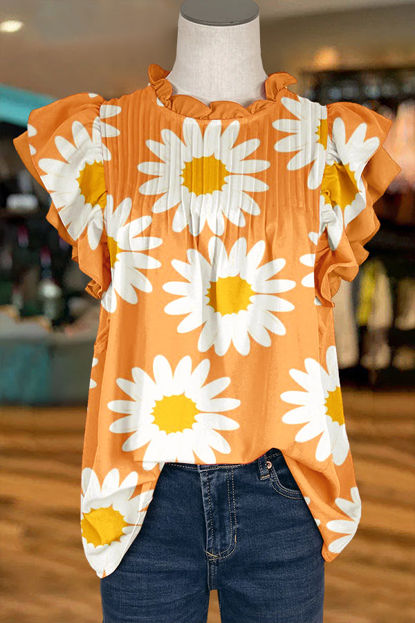 Chic Floral Ruffled Sleeve Paneled Pleated Blouse