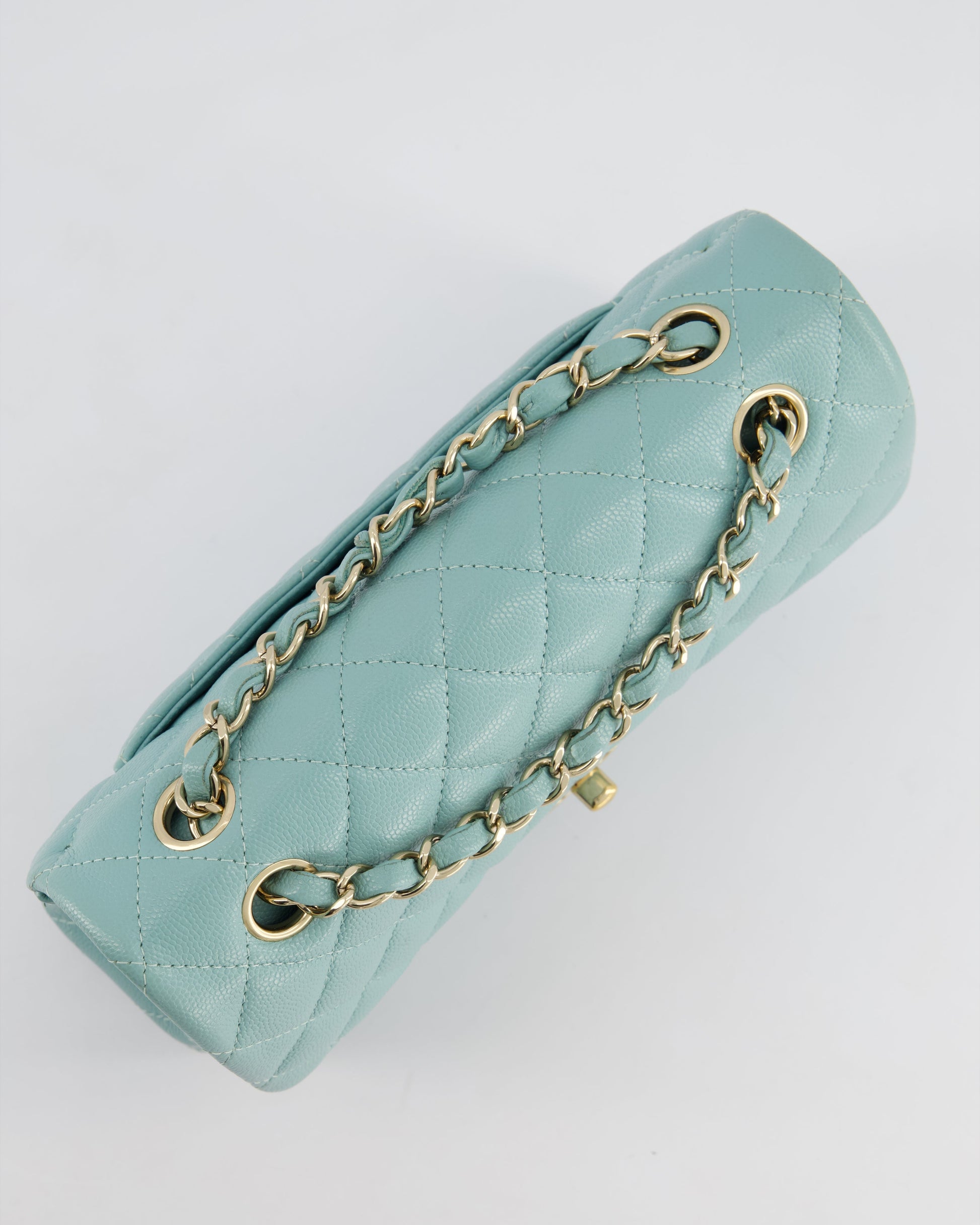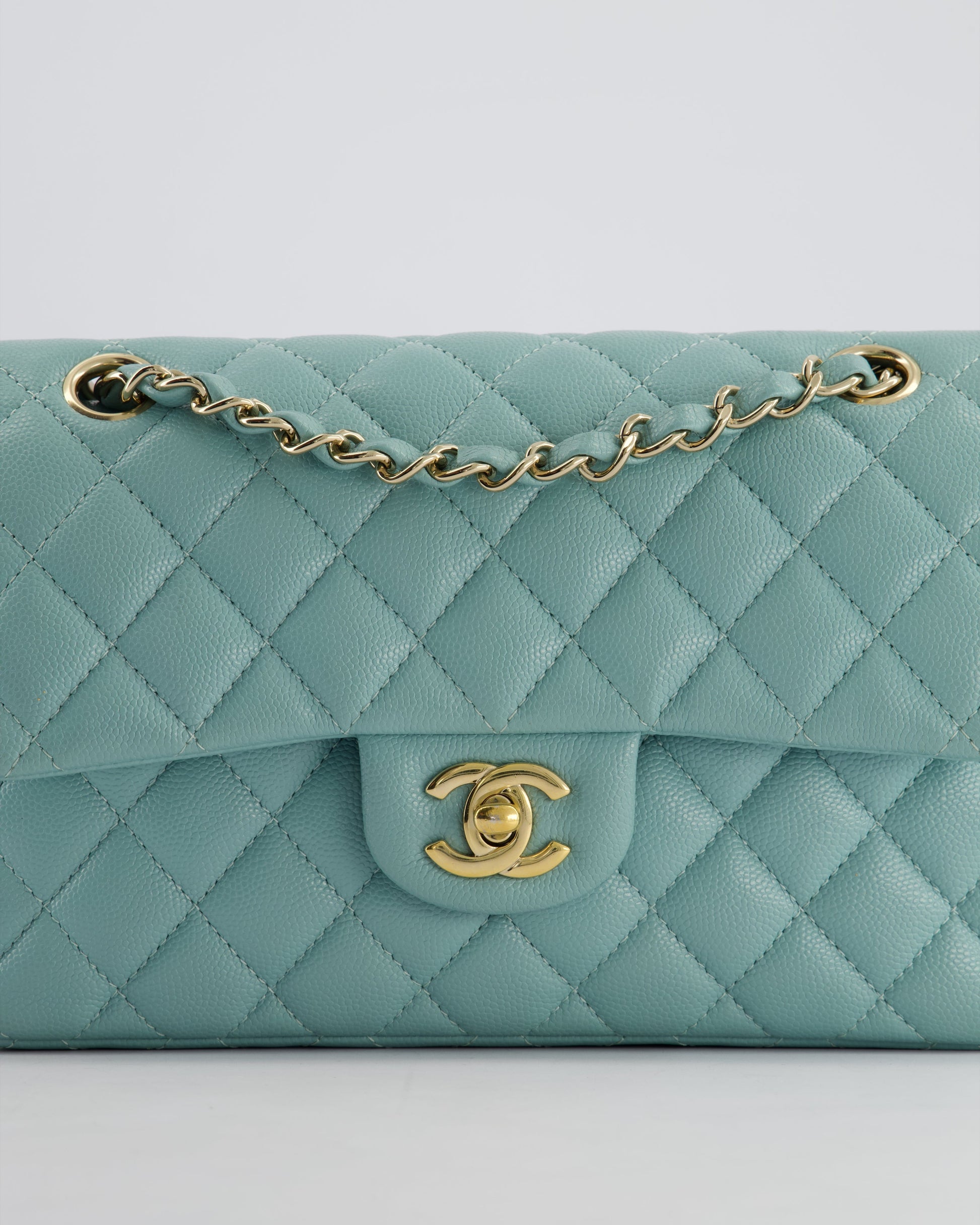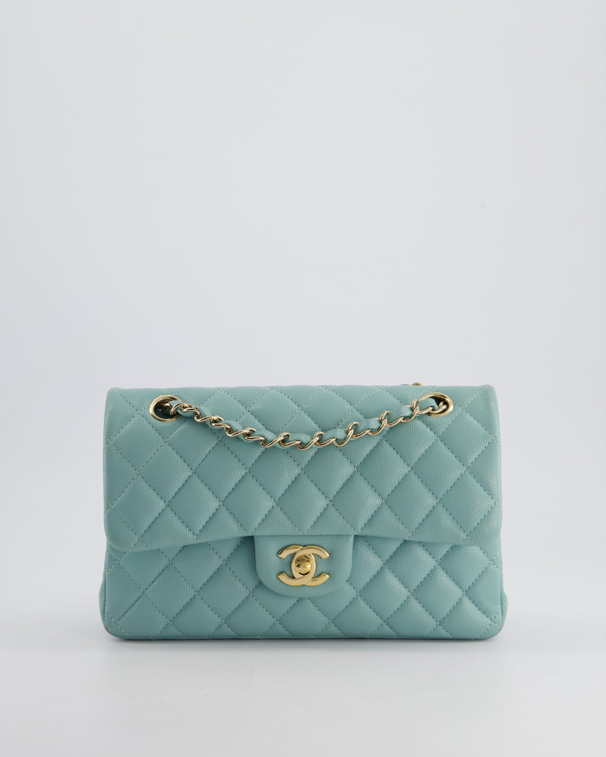 *HOT* Chanel Celeste Blue Small Classic Double Flap Bag in Caviar Leather with Champagne Gold Hardware