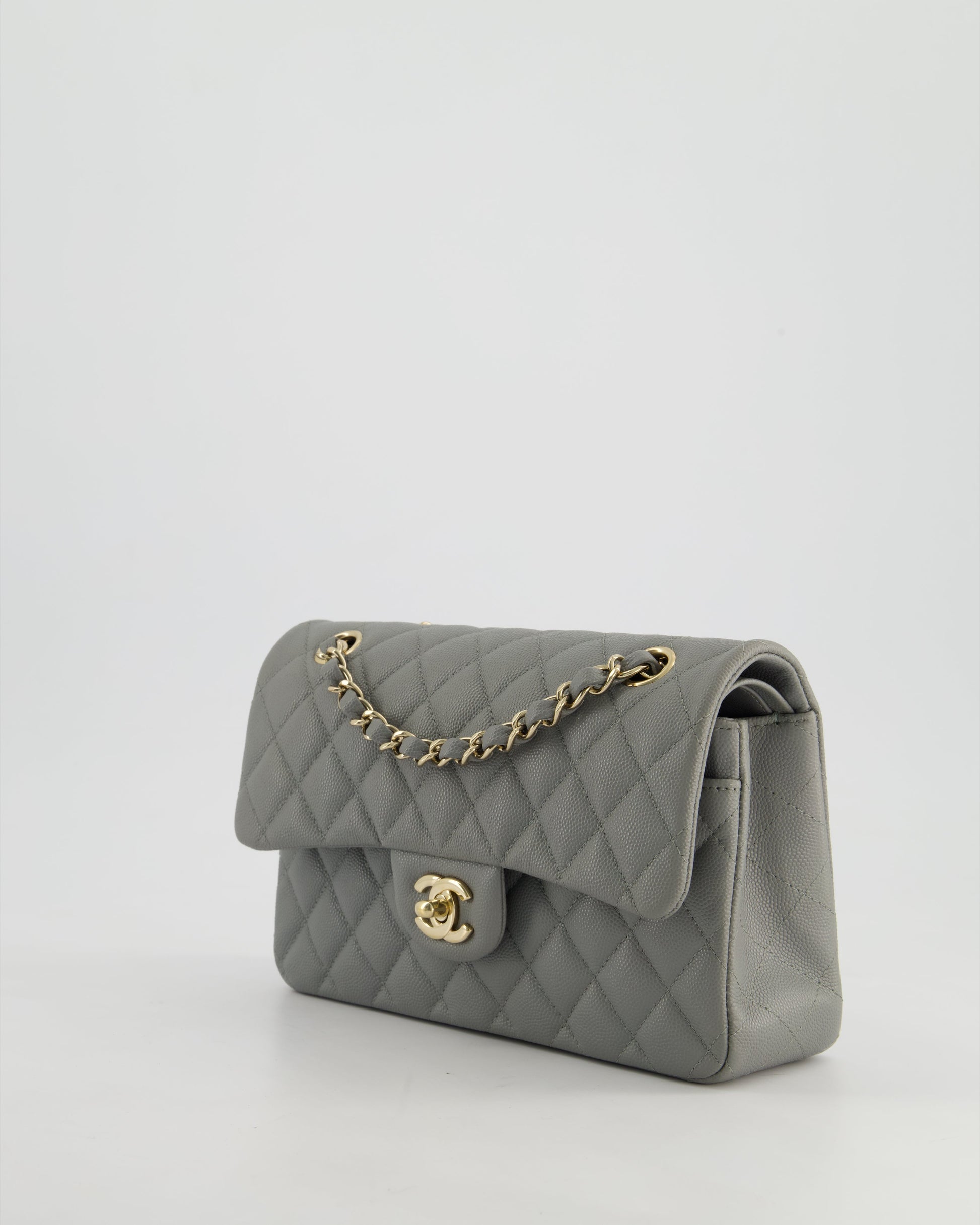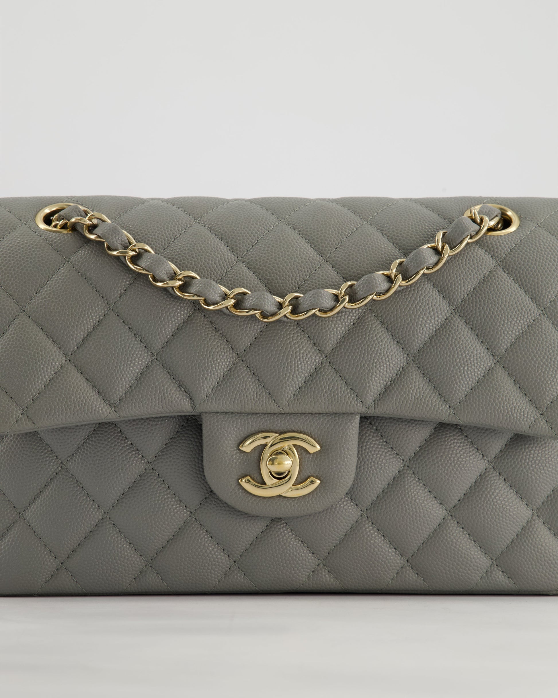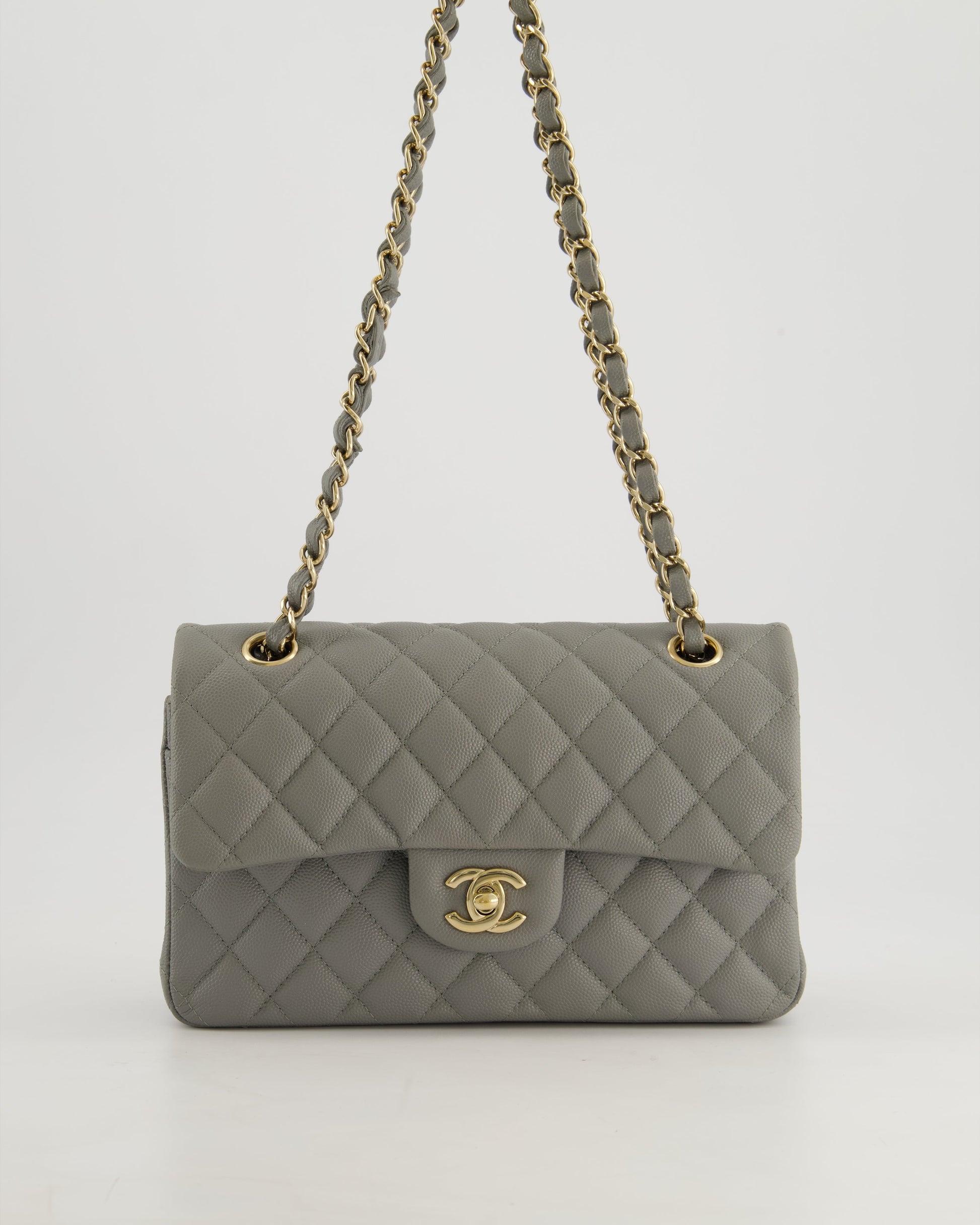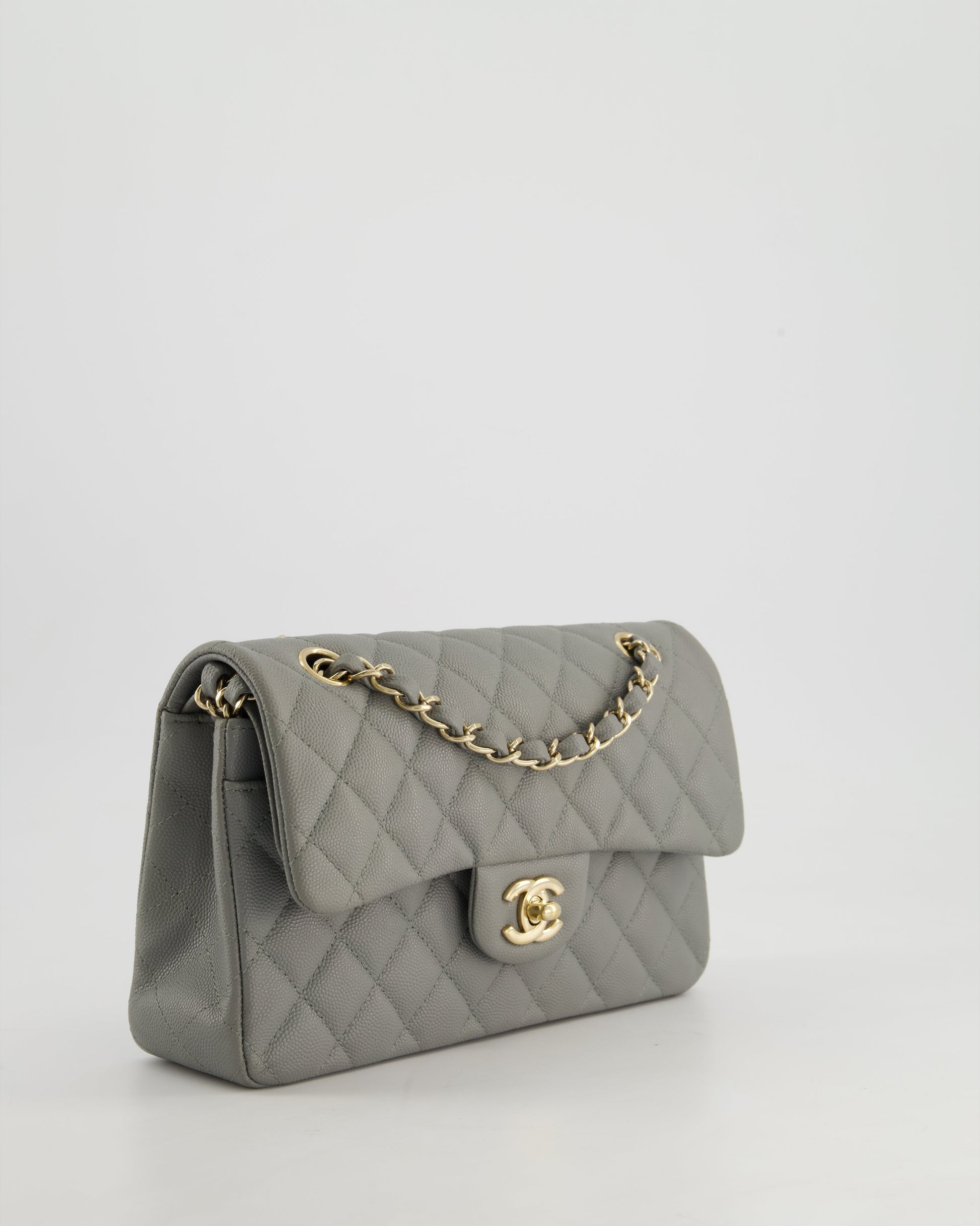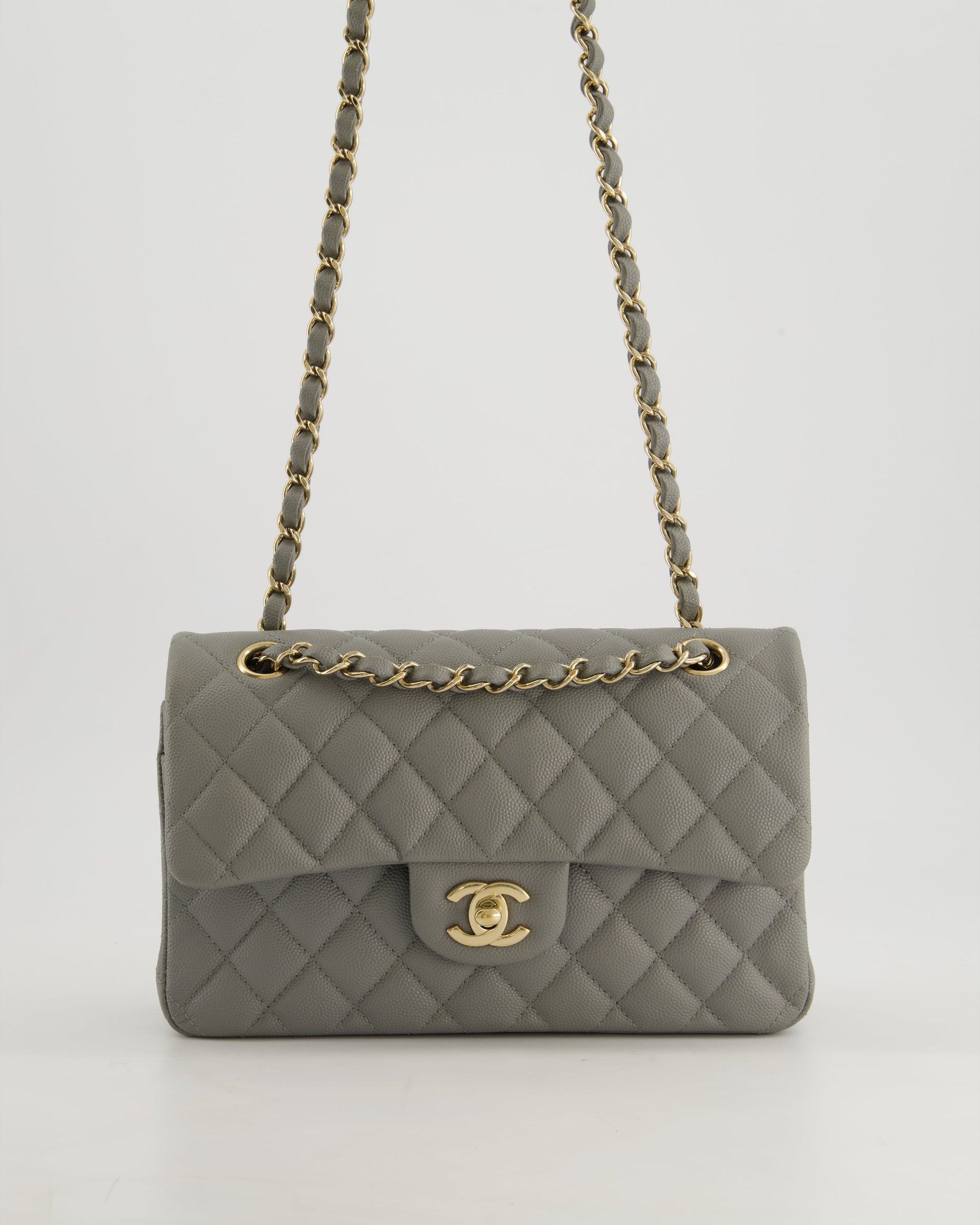*HOT & RARE* Chanel Stone Grey Small Classic Double Flap Bag in Caviar Leather with Champagne Gold Hardware